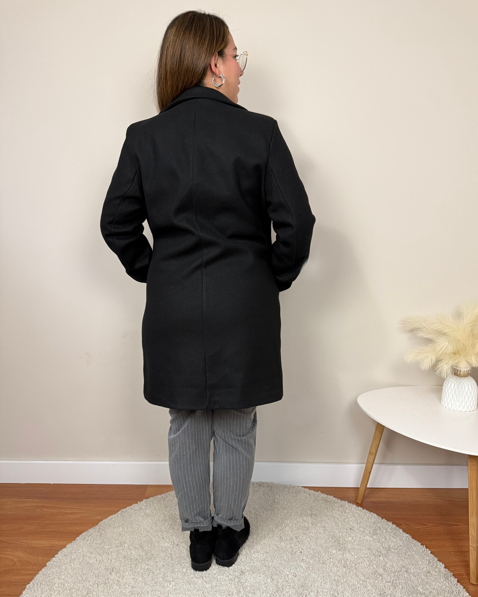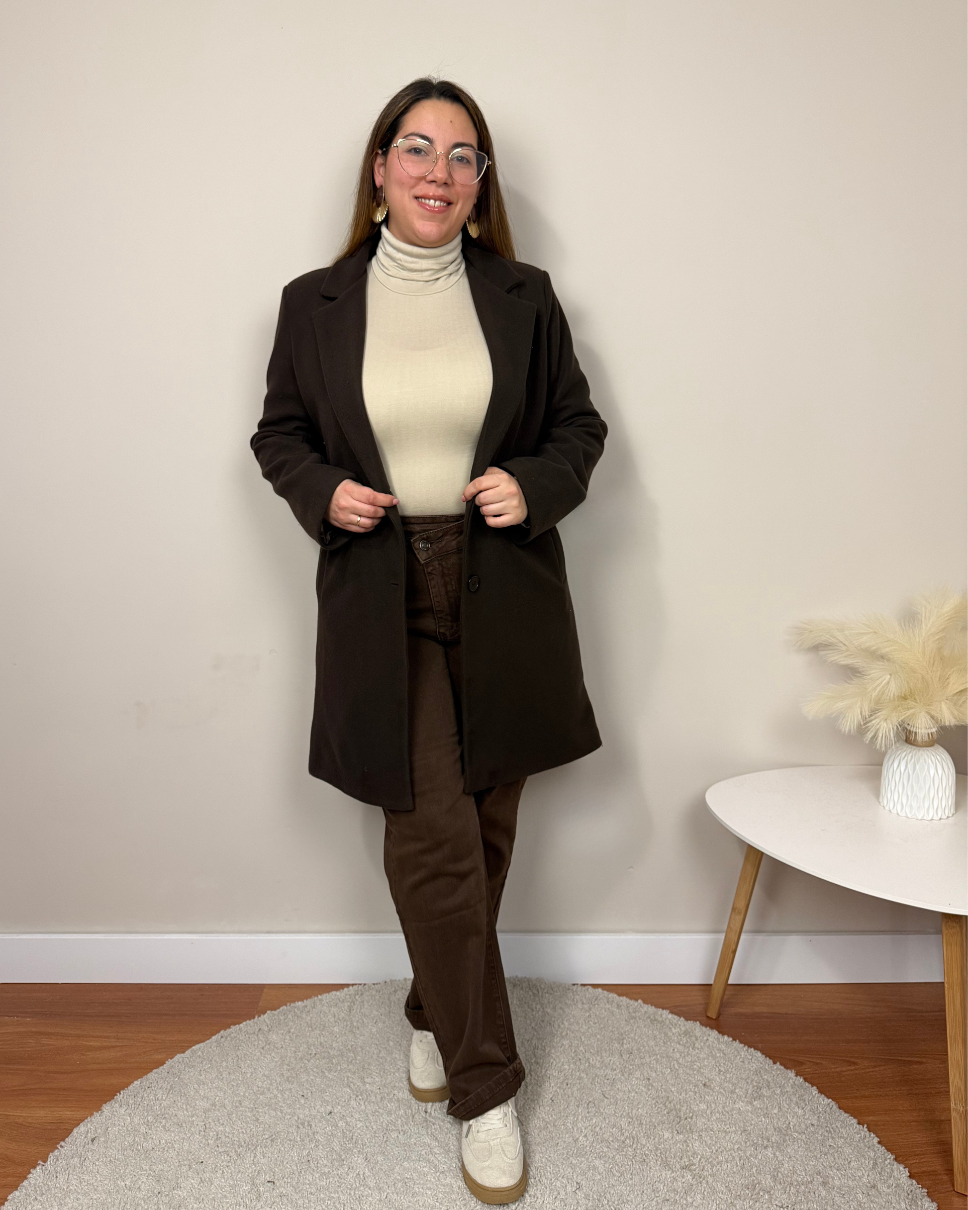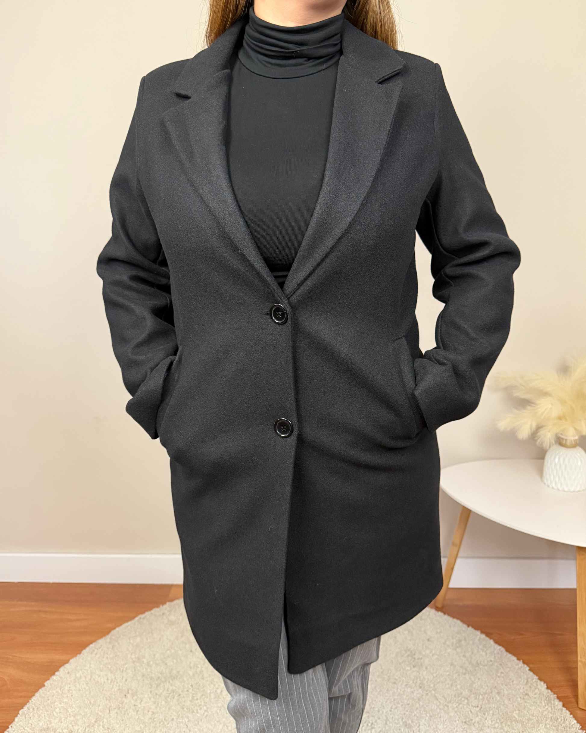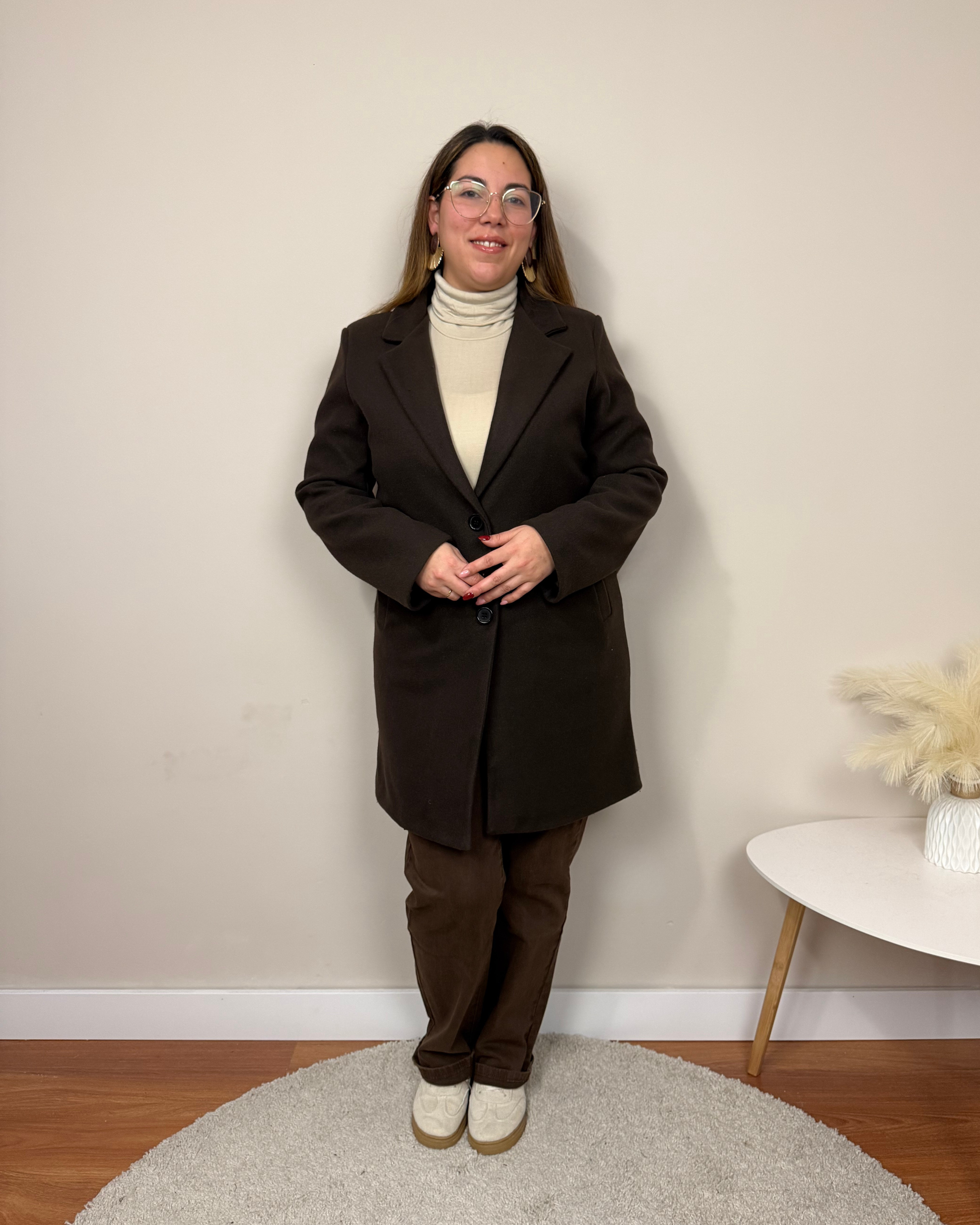 El Abrigo Essencial es un abrigo de paño de corte clásico, con largo por encima de la rodilla, solapas y hombreras que estructuran la figura. Incorpora dos botones, bolsillos funcionales y forro interior para mayor comodidad. Una prenda pensada para acompañarte en tu día a día con estilo