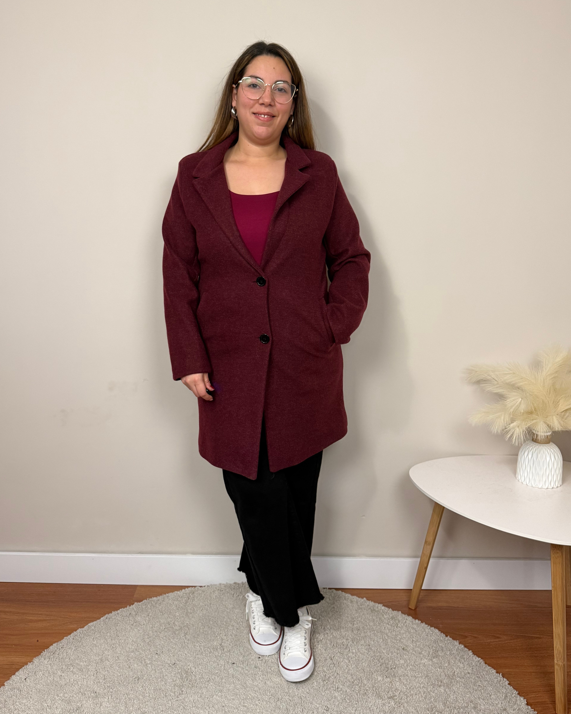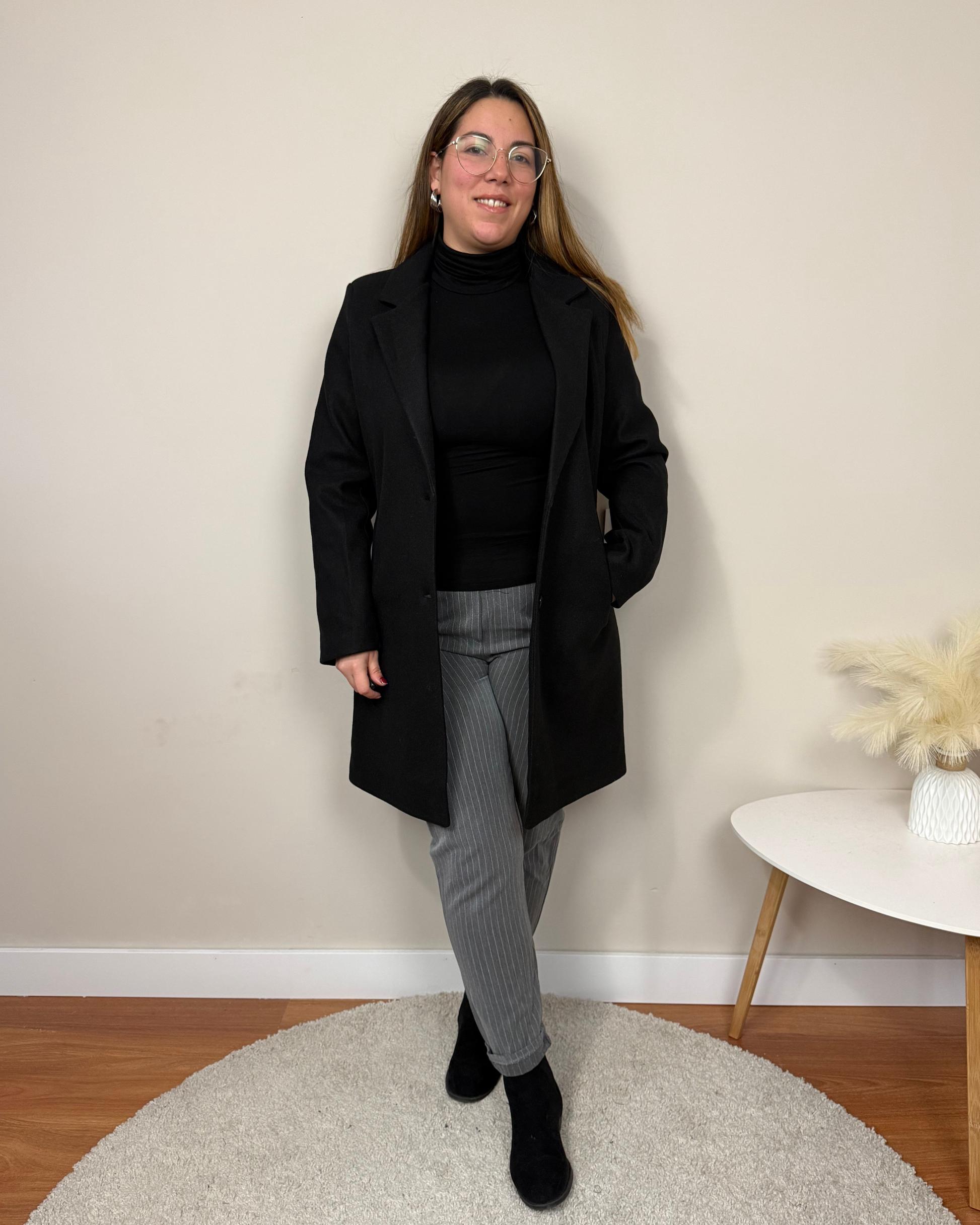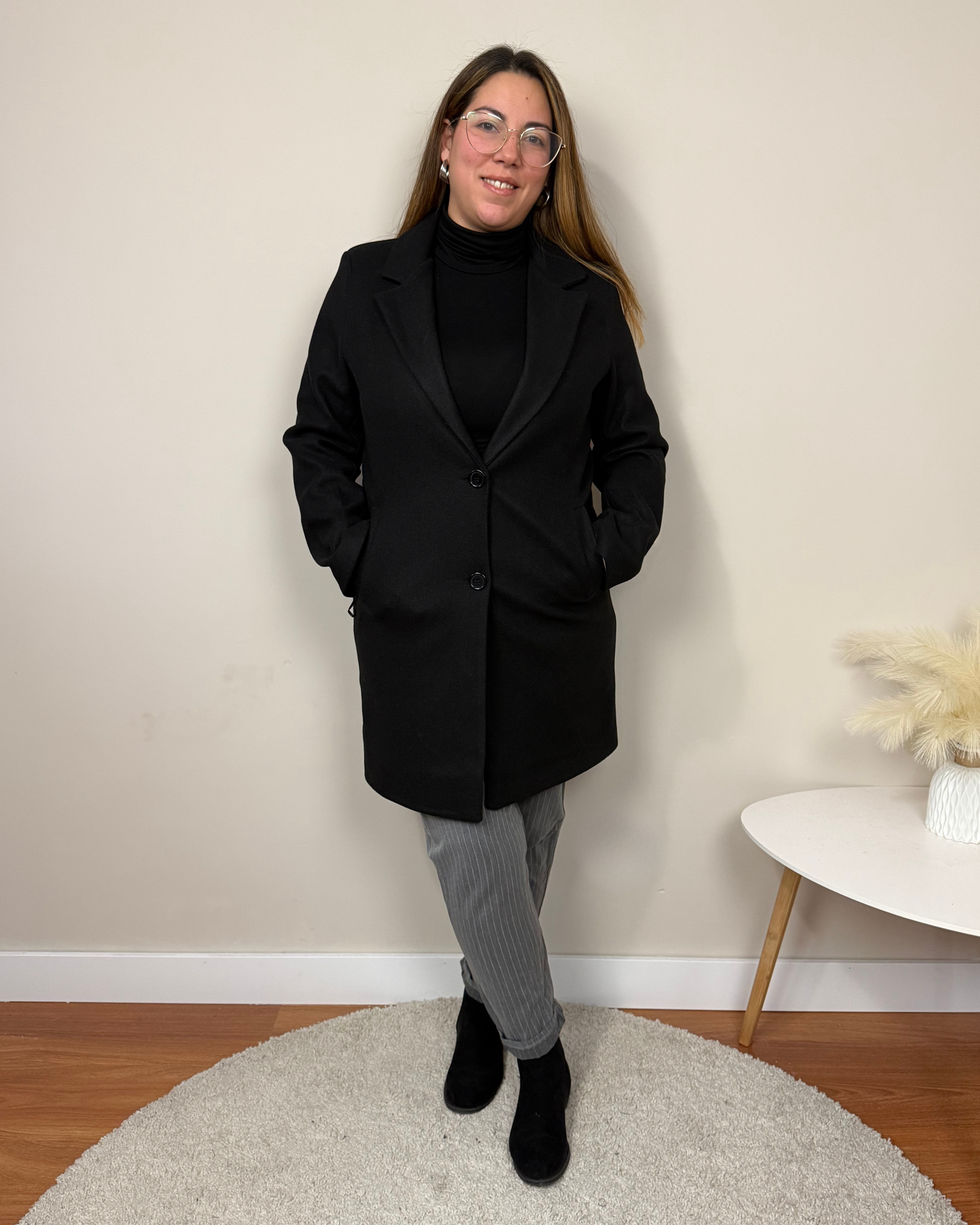 El Abrigo Essencial es un abrigo de paño de corte clásico, con largo por encima de la rodilla, solapas y hombreras que estructuran la figura. Incorpora dos botones, bolsillos funcionales y forro interior para mayor comodidad. Una prenda pensada para acompañarte en tu día a día con estilo