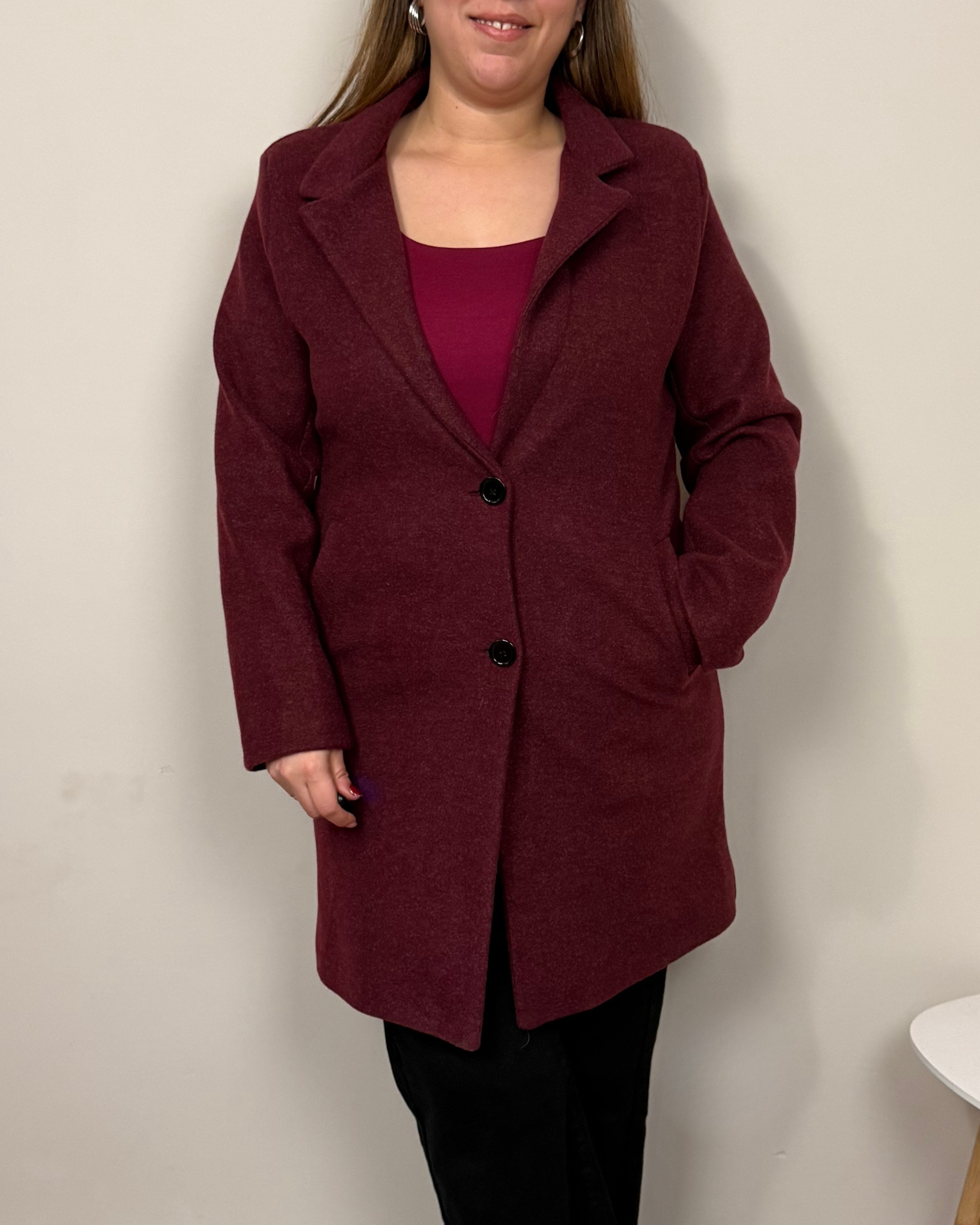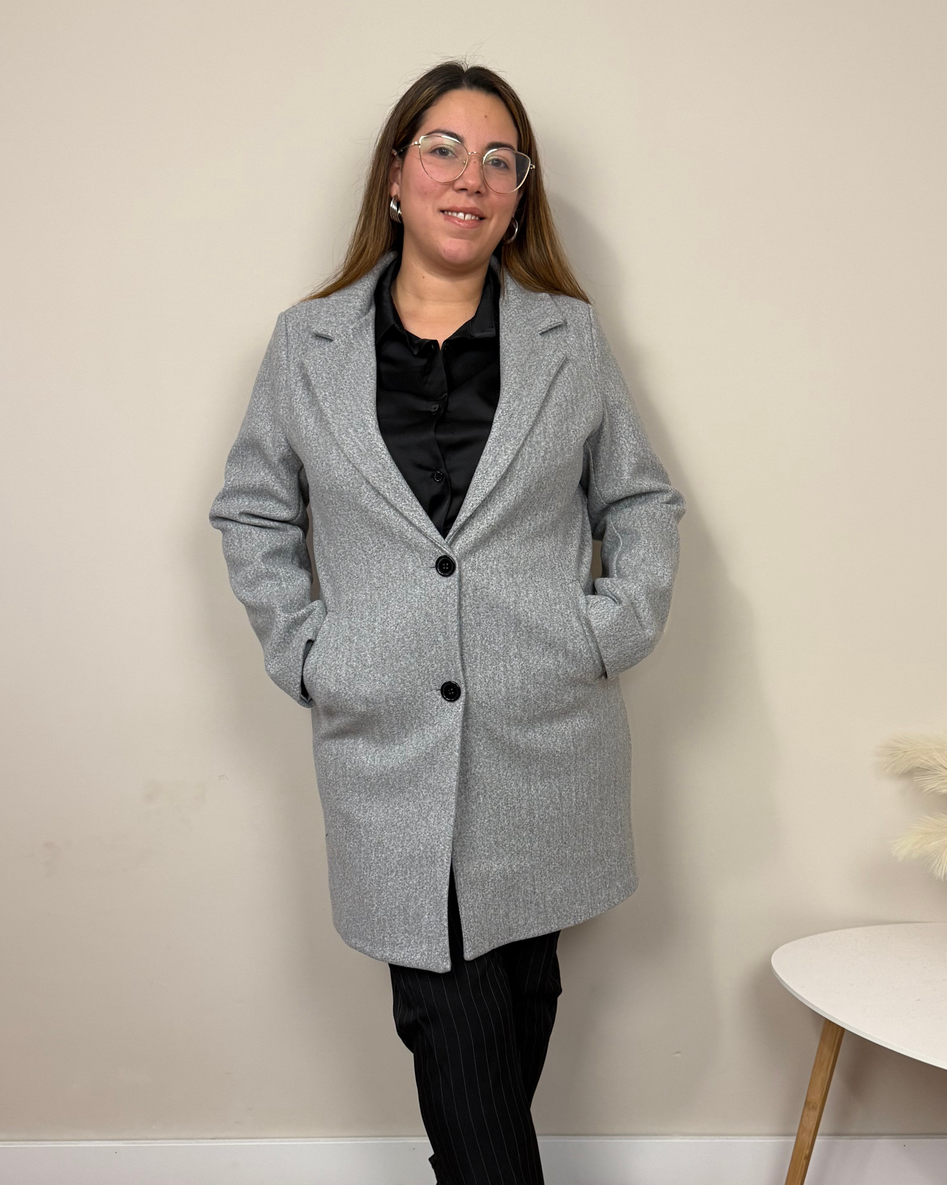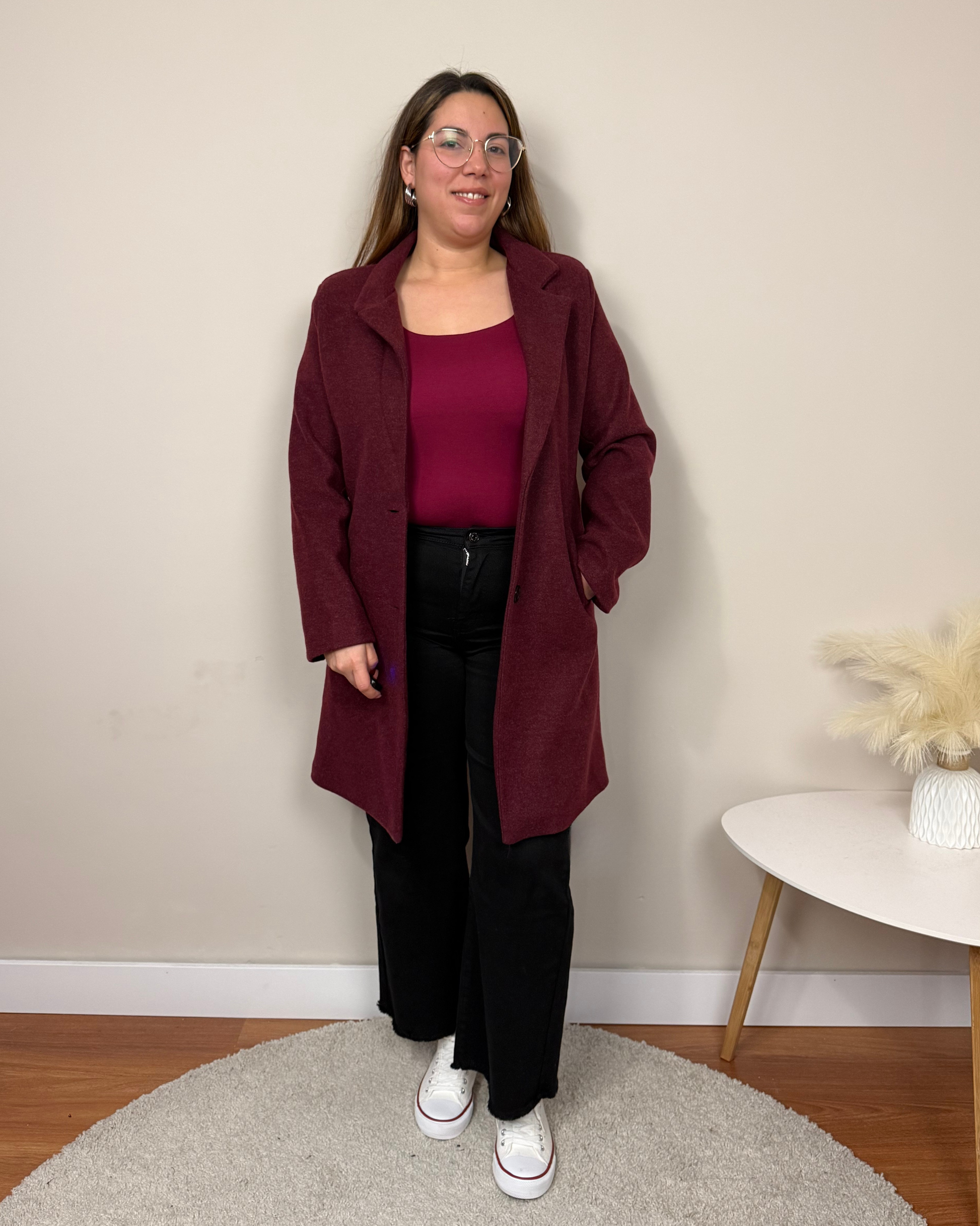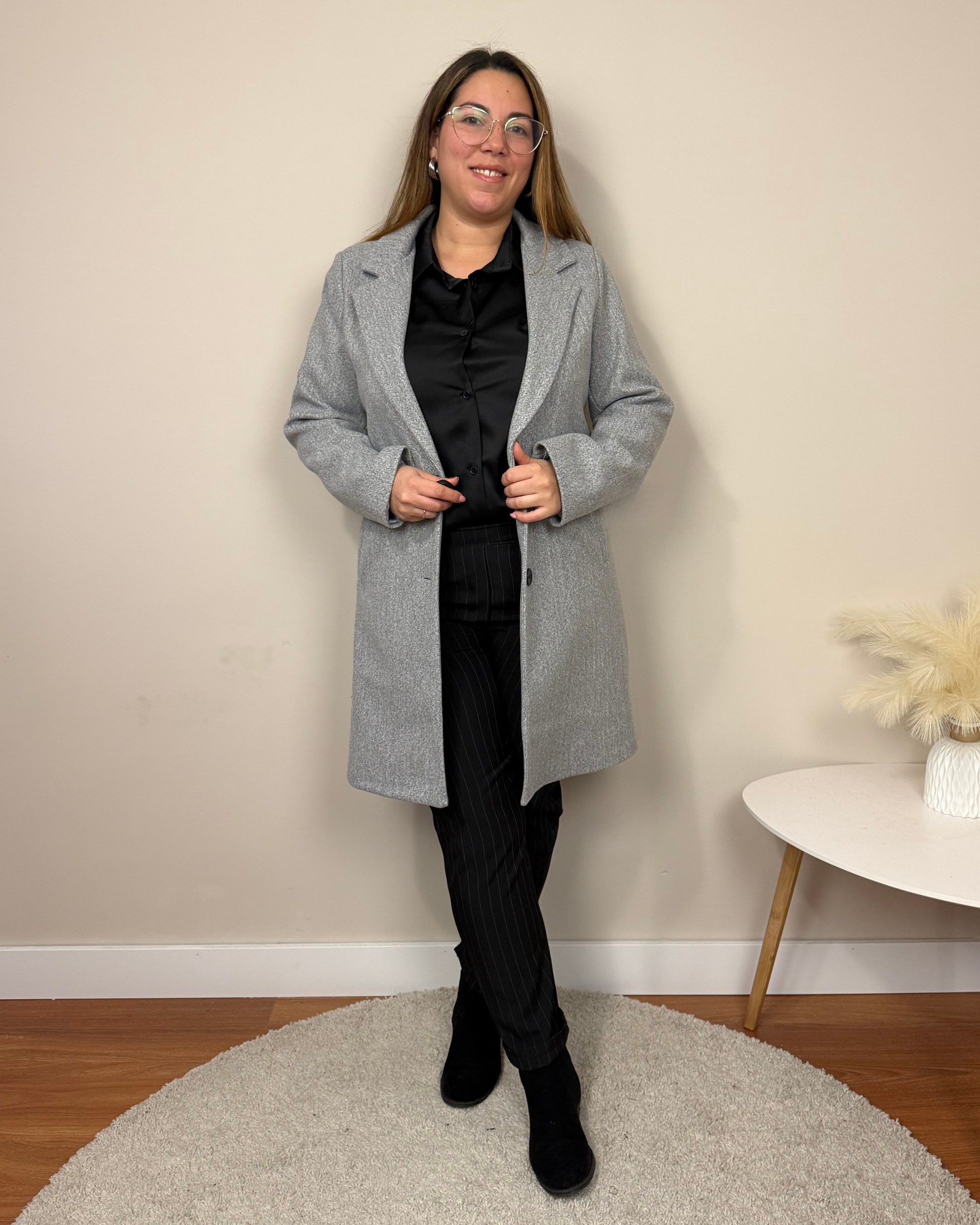 El Abrigo Essencial es un abrigo de paño de corte clásico, con largo por encima de la rodilla, solapas y hombreras que estructuran la figura. Incorpora dos botones, bolsillos funcionales y forro interior para mayor comodidad. Una prenda pensada para acompañarte en tu día a día con estilo