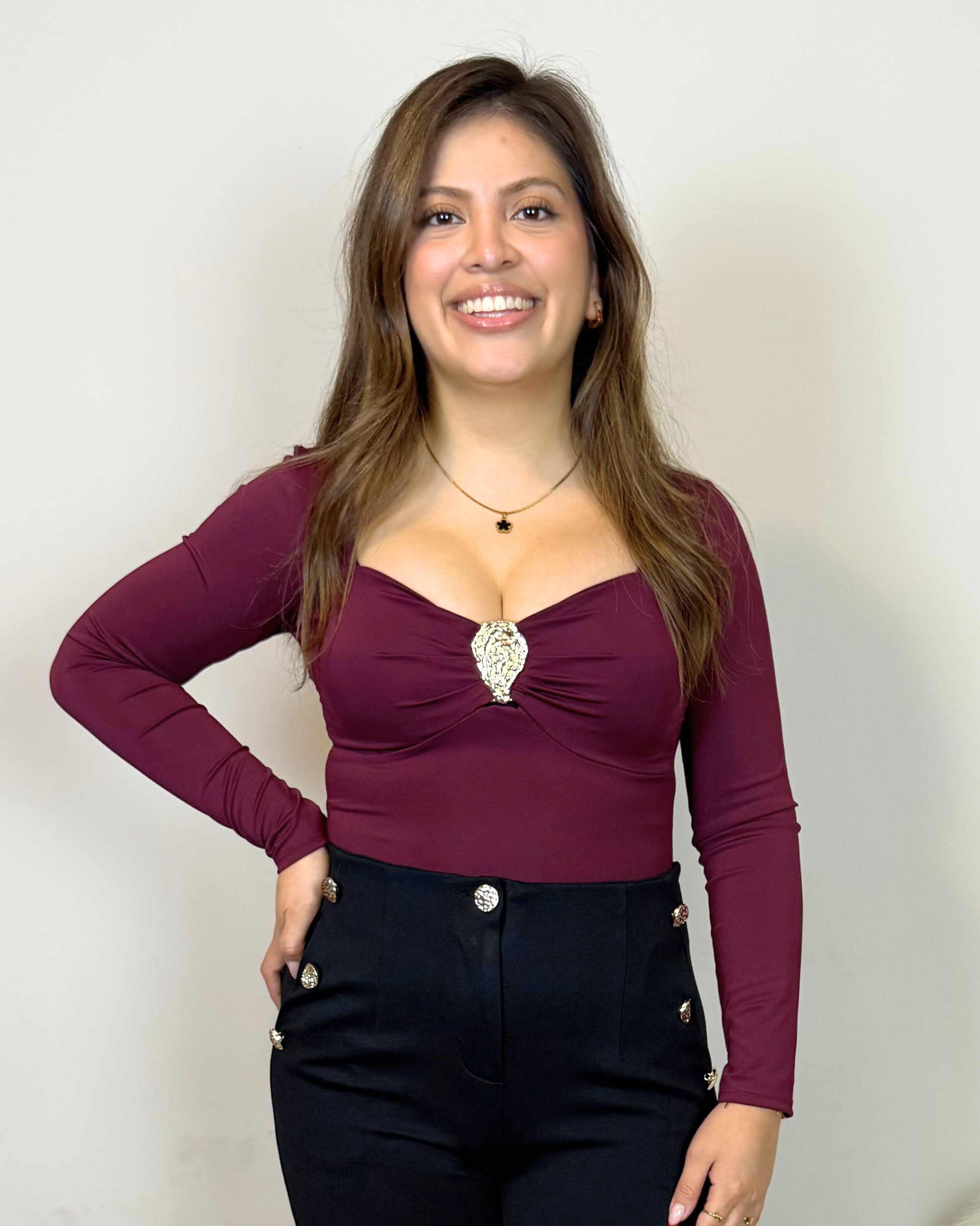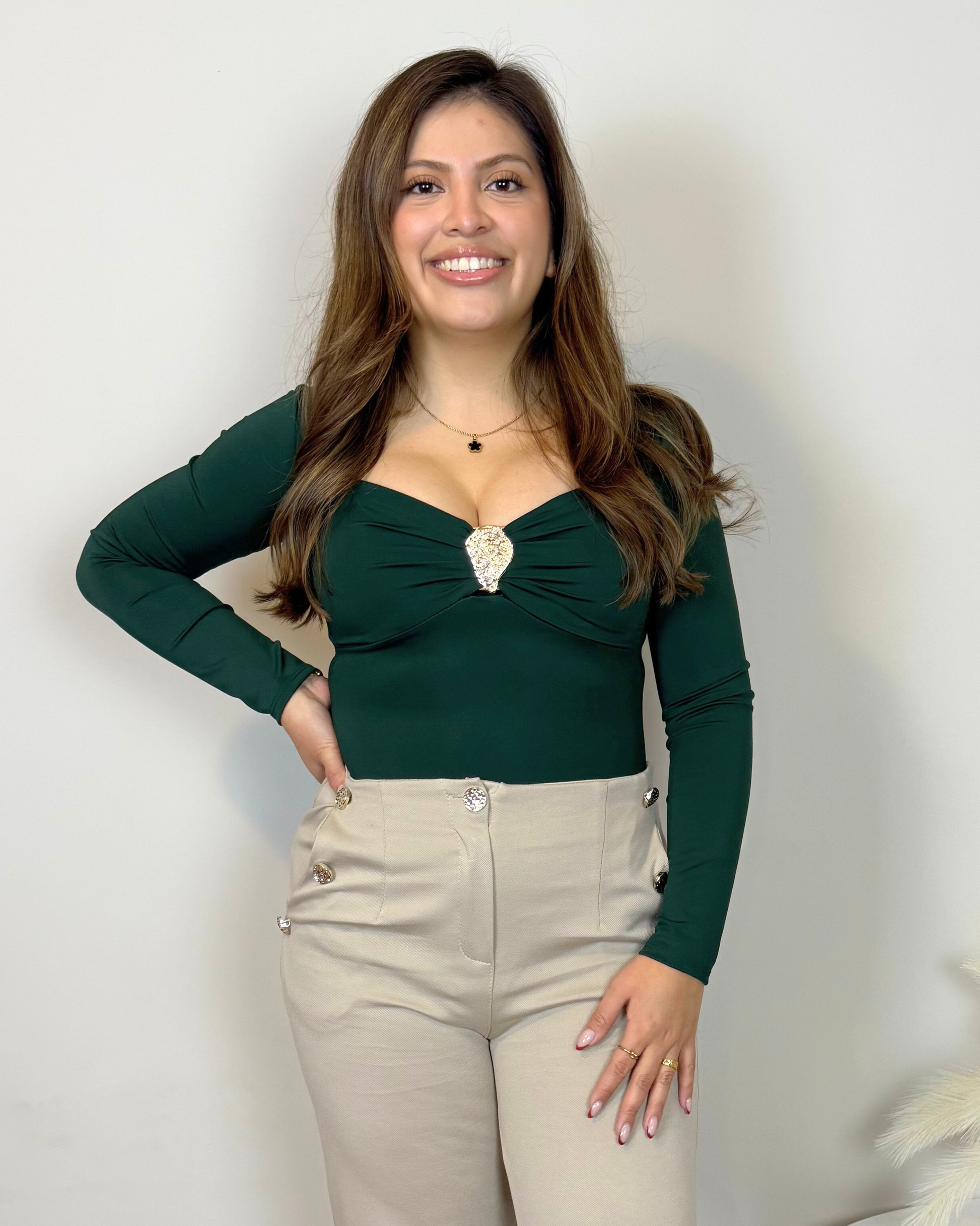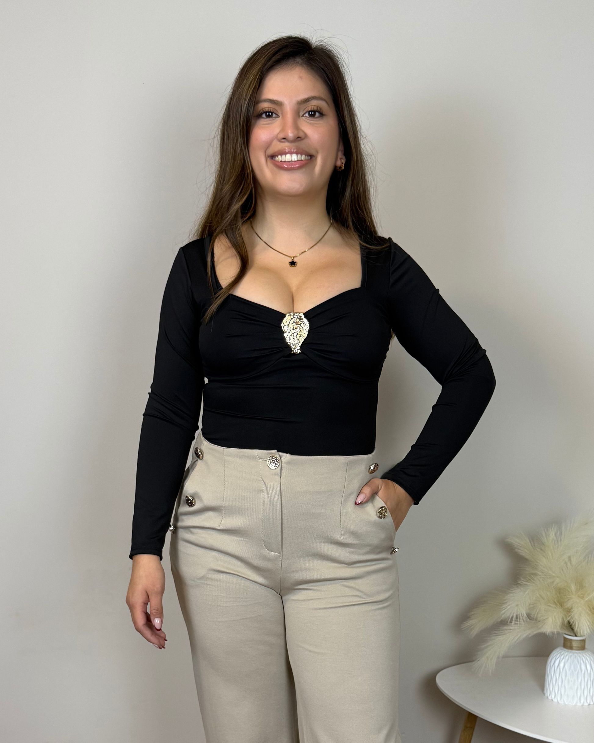 Body de licra suave que se adapta al cuerpo con un ajuste favorecedor. Incorpora copas en el pecho para mayor comodidad y un detalle dorado en el escote que aporta un toque sofisticado y luminoso. Ideal para crear outfits elegantes y seguros en cenas, eventos o noches especiales.