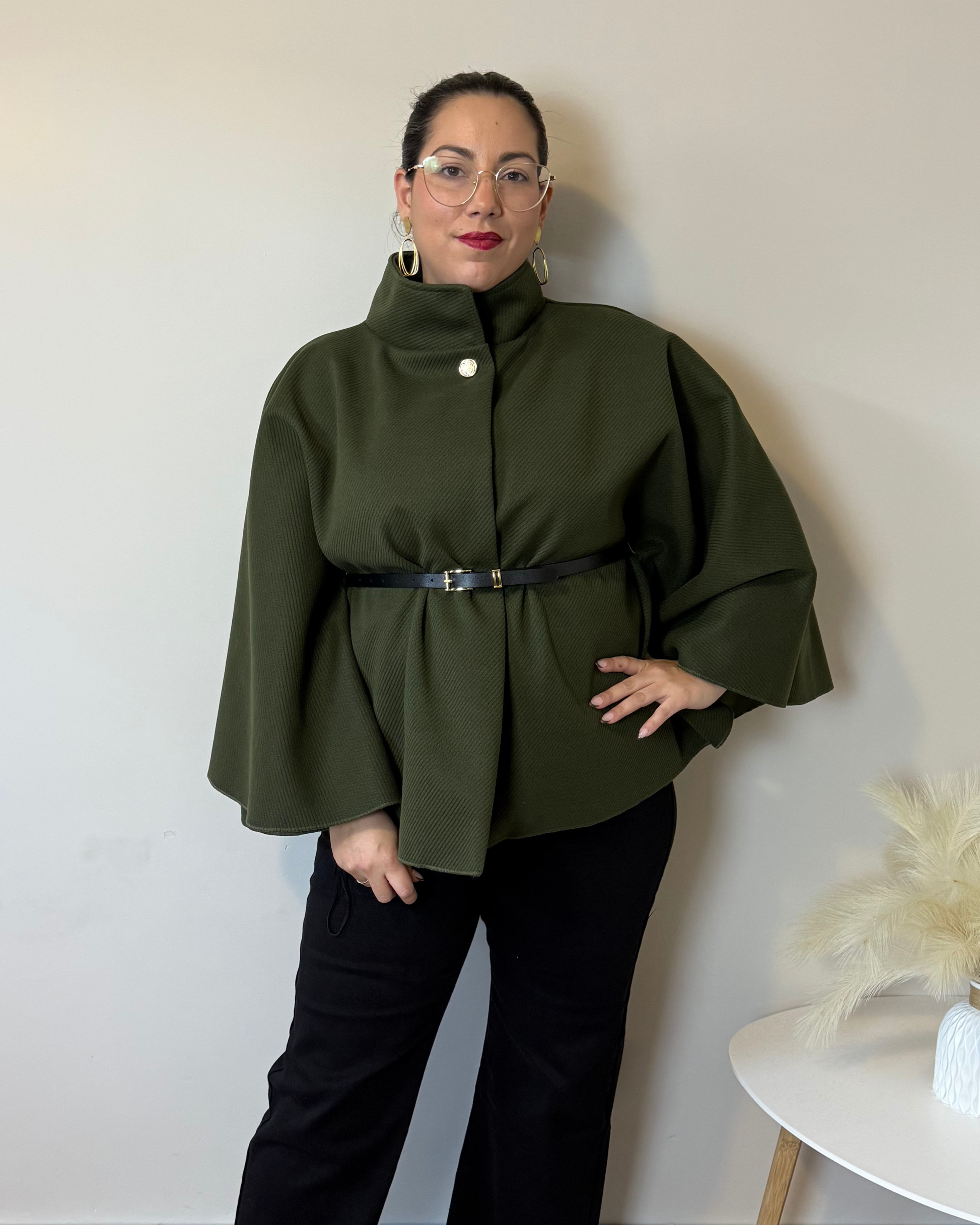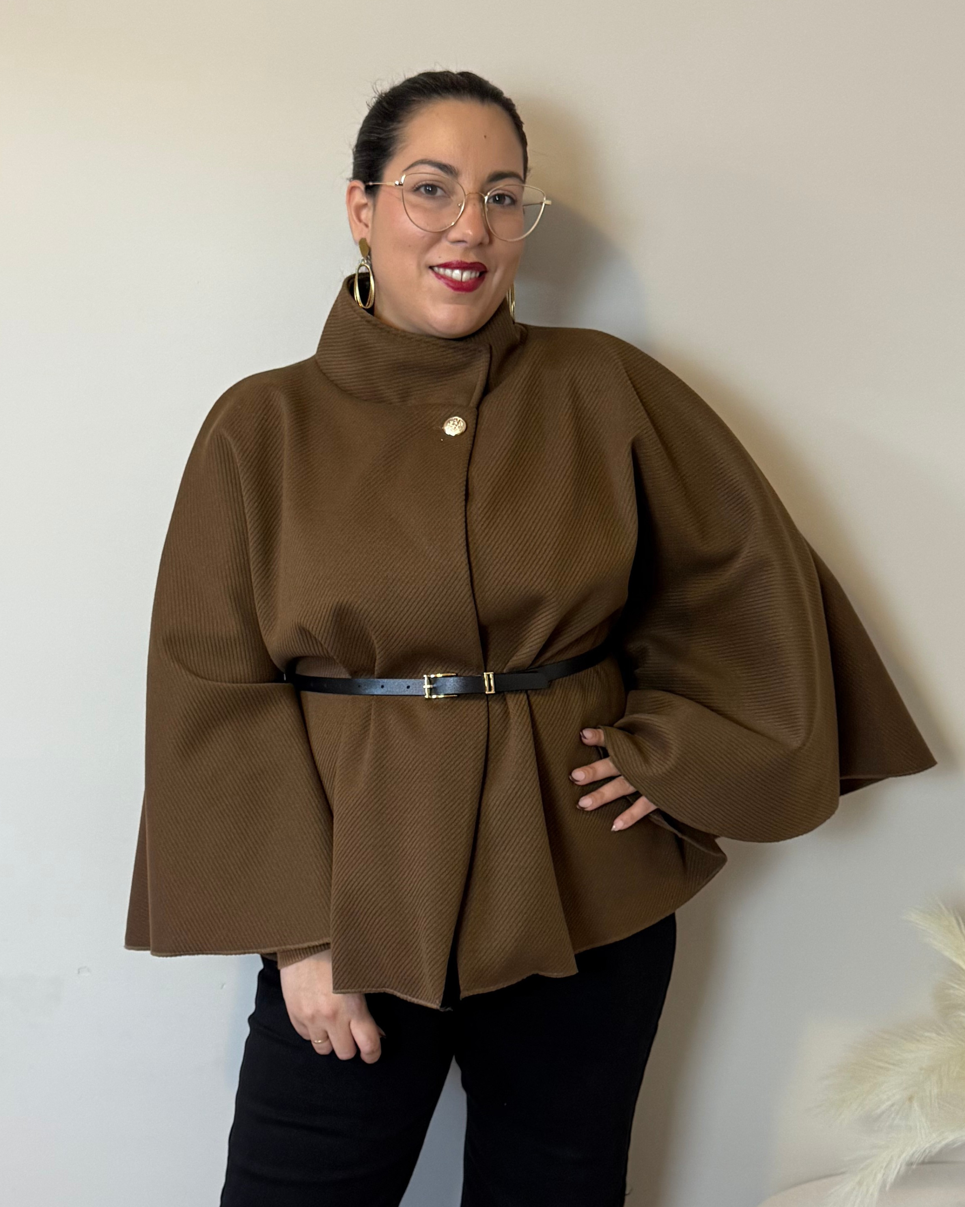 La Capa Bella es pura elegancia y estilo. Incluye un cinturón negro que realza la cintura y un botón dorado en el cuello que aporta un toque sofisticado.