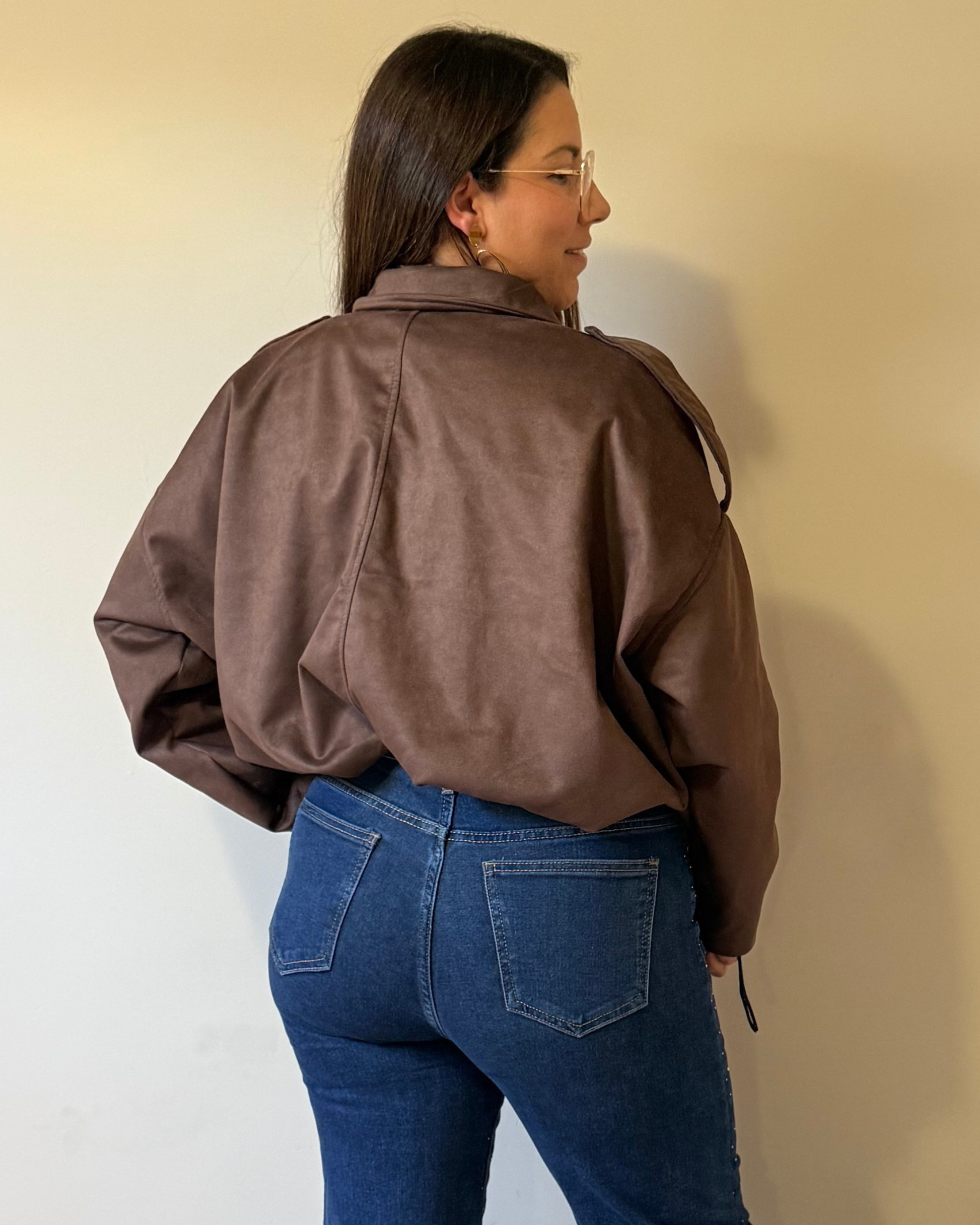 Nuestra bomber de antelina combina estilo y suavidad. Con manga larga, cremallera delantera y detalle de solapa en los hombros, se ajusta perfectamente gracias a su cintura elástica.