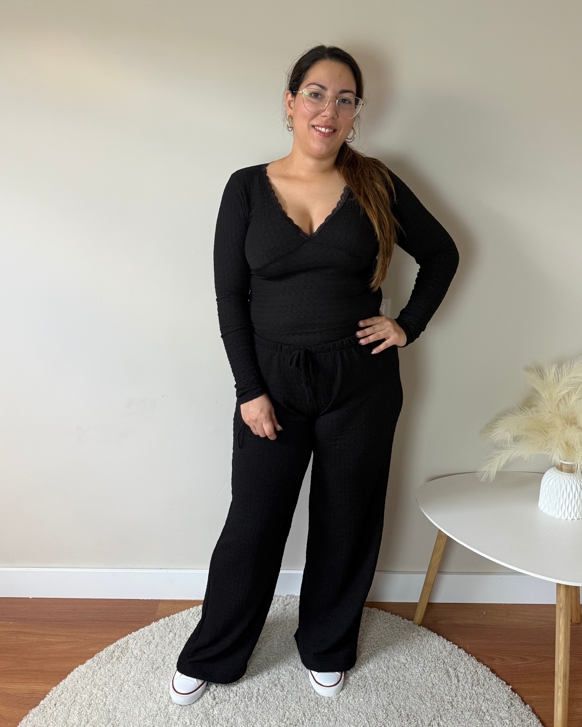 El Conjunto Amara, de bambula, es ligero y cómodo. La camiseta de manga larga con escote pico y detalle de encaje aporta un toque romántico, mientras que el pantalón ancho con cinturilla elástica y cordón delantero garantiza comodidad y estilo.