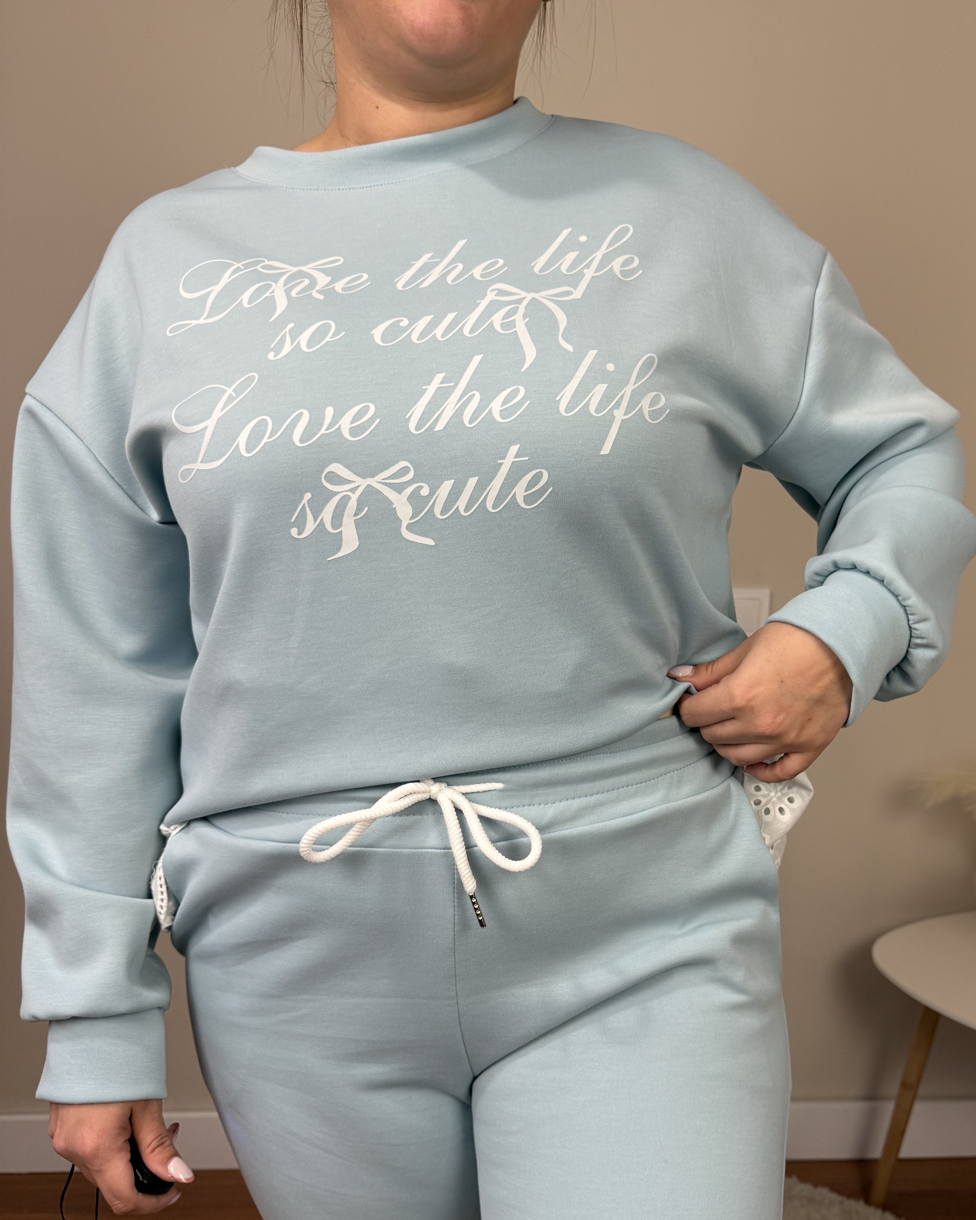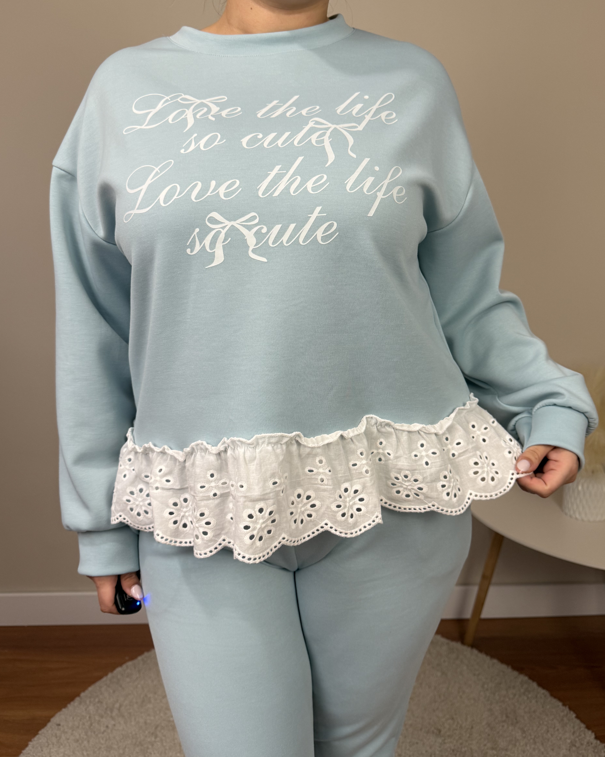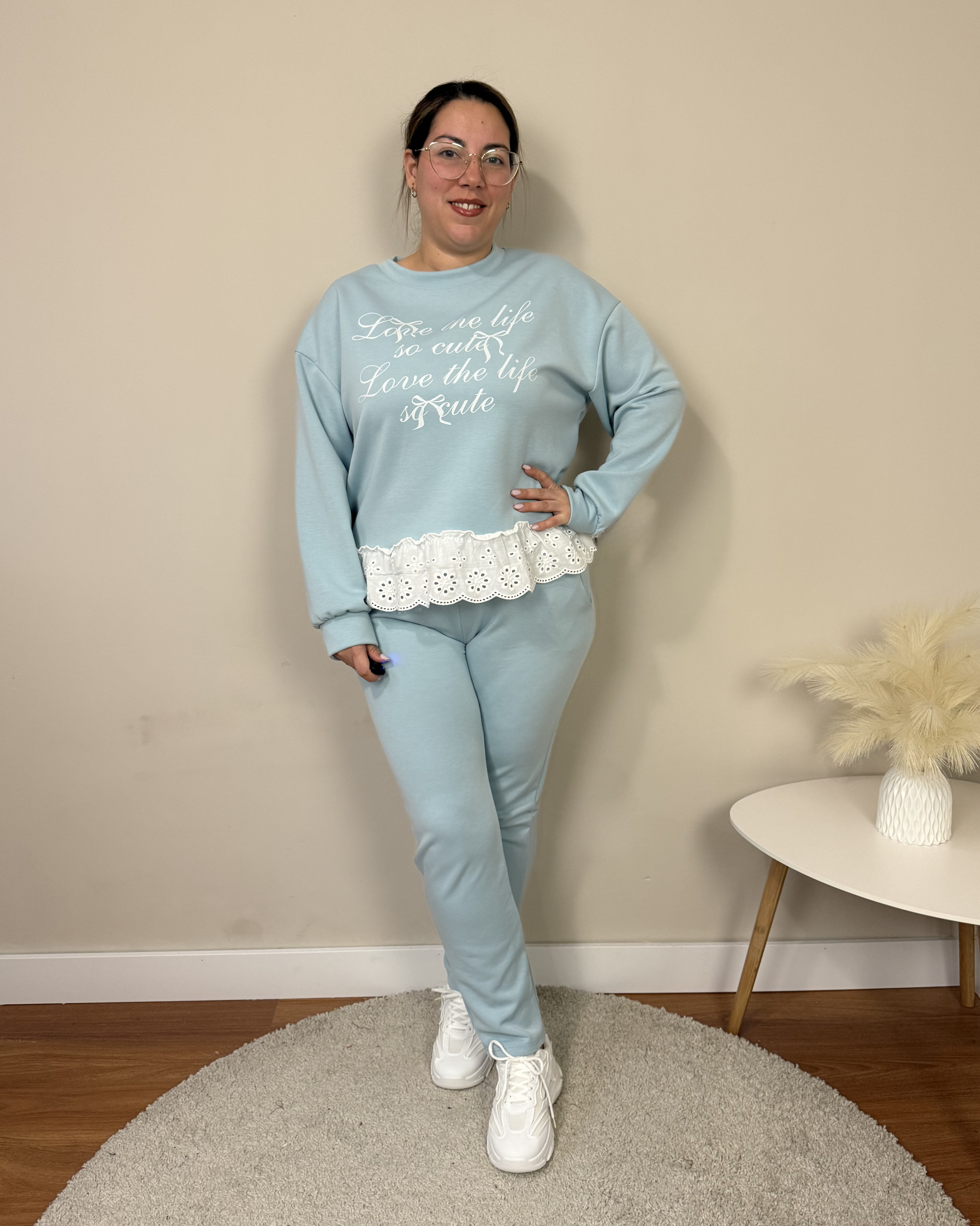 El Conjunto Cute es un conjunto cómodo y actual. La parte de arriba tiene letras en la parte de delante y un ribete de bordado ingles en el bajo que aporta un toque delicado y especial. El pantalón de corte estrecho incorpora bolsillos y cintura elástica con cordón ajustable, combinando estilo y comodidad para el día a día.