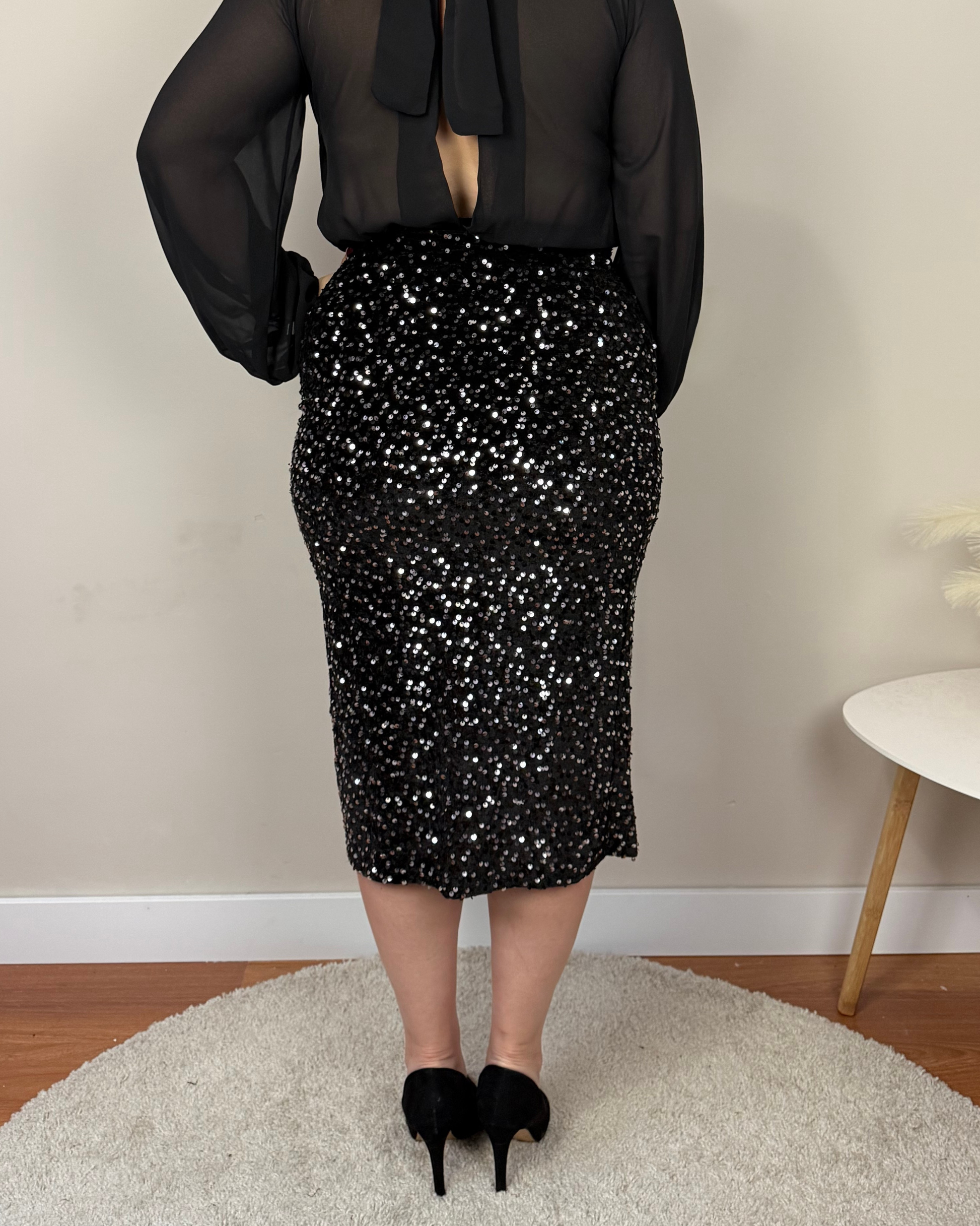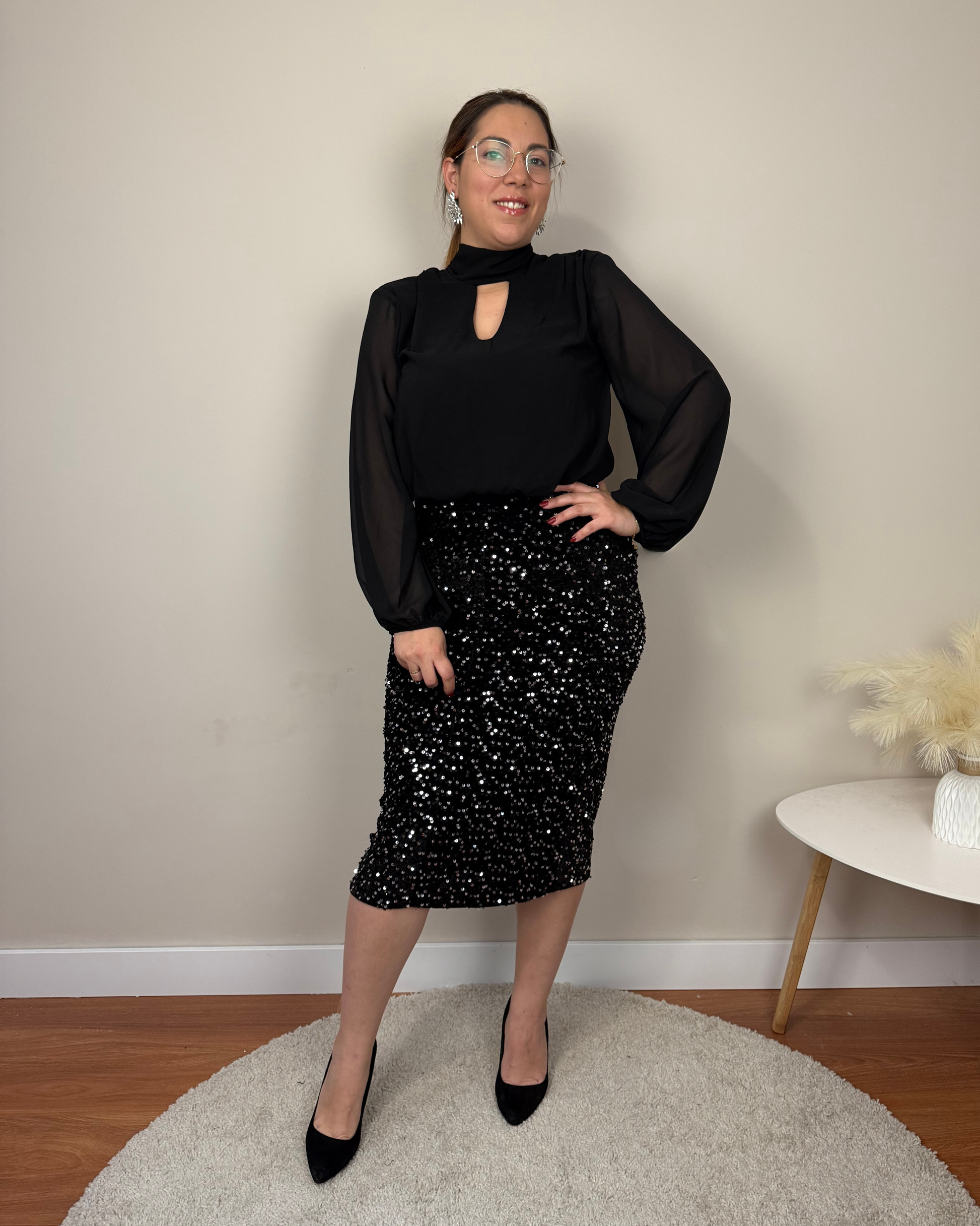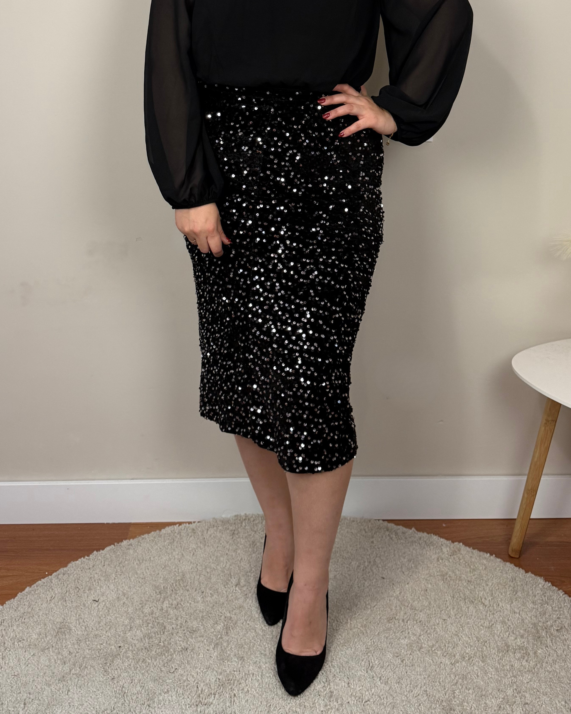 Falda midi negra de pelito con brillo de lentejuelas, diseñada para deslumbrar. Cintura elástica que garantiza comodidad y ajuste perfecto. Su corte elegante y textura sofisticada hacen de esta falda un must para eventos nocturnos y outfits de fiesta inolvidables.