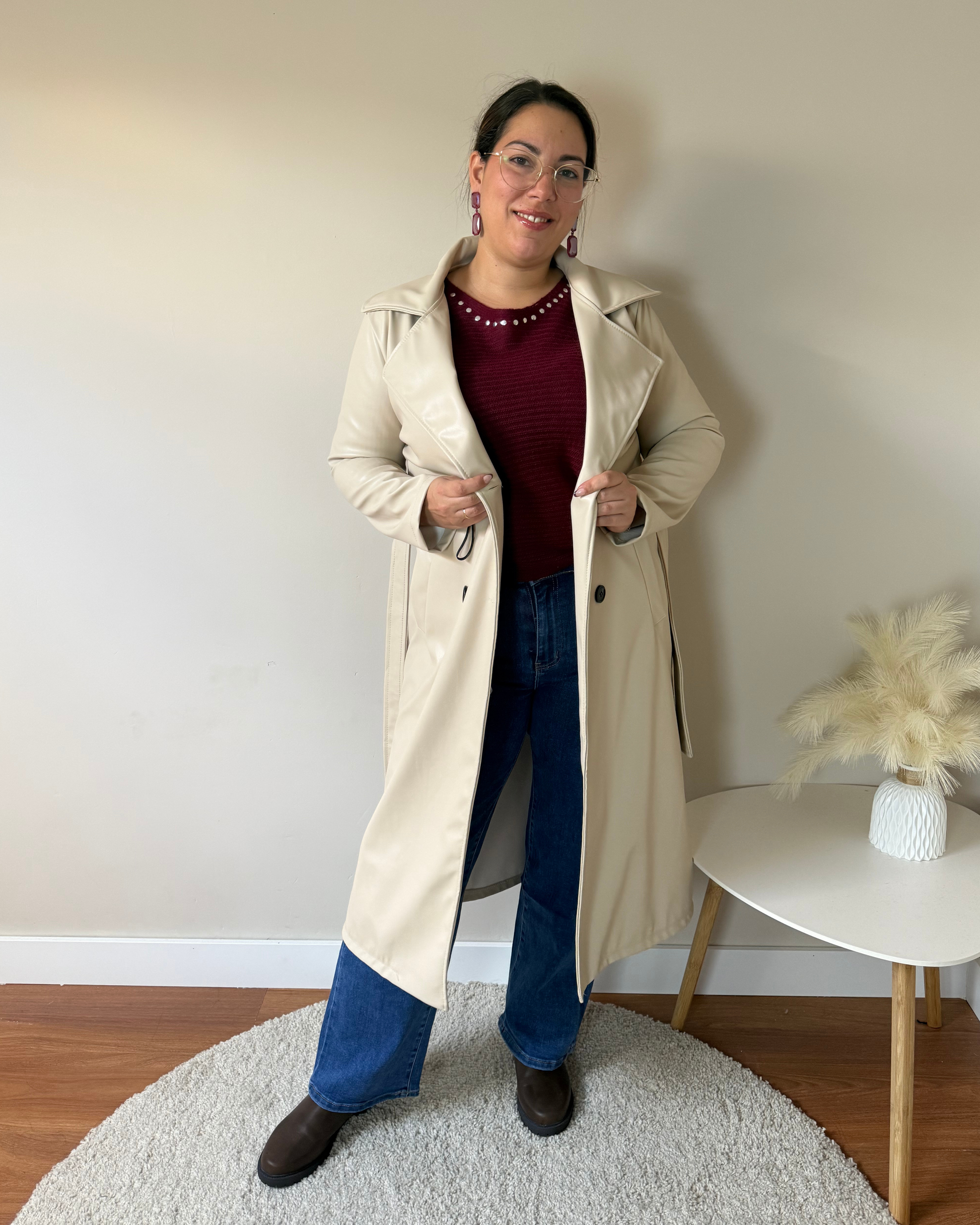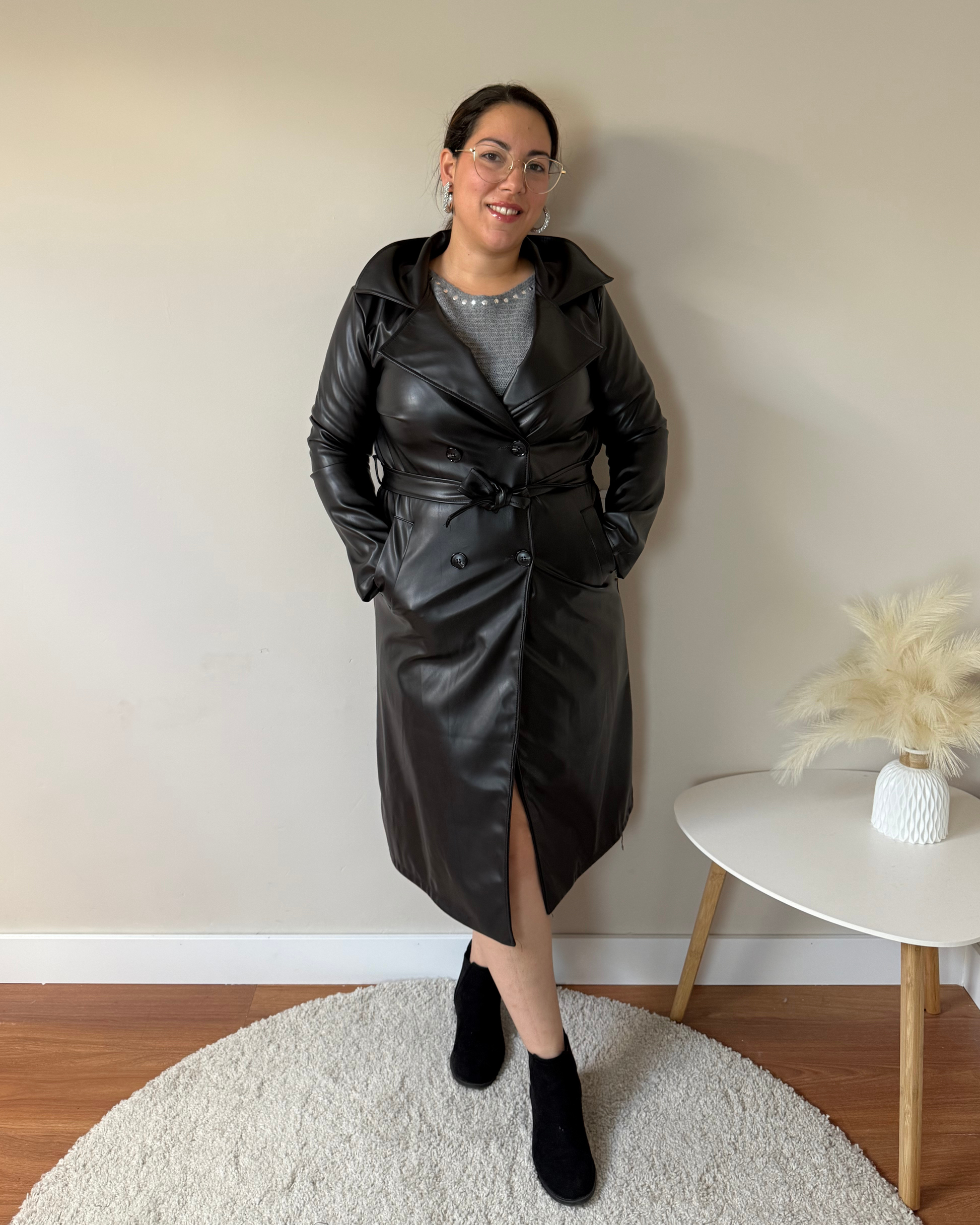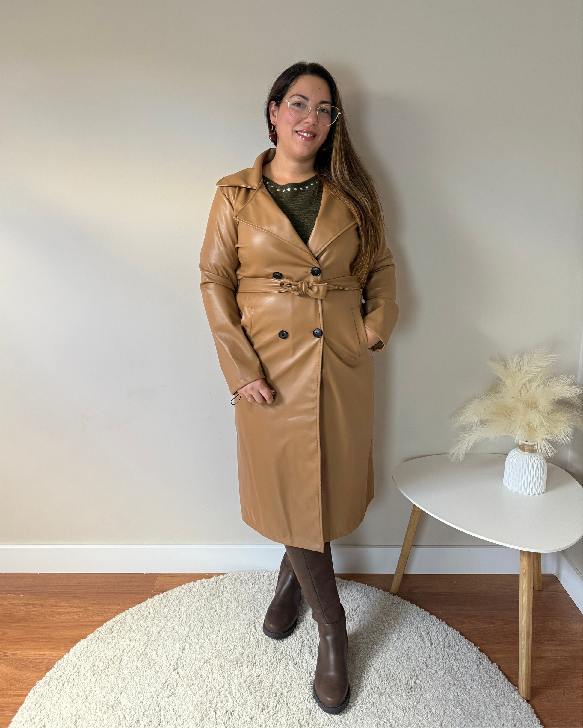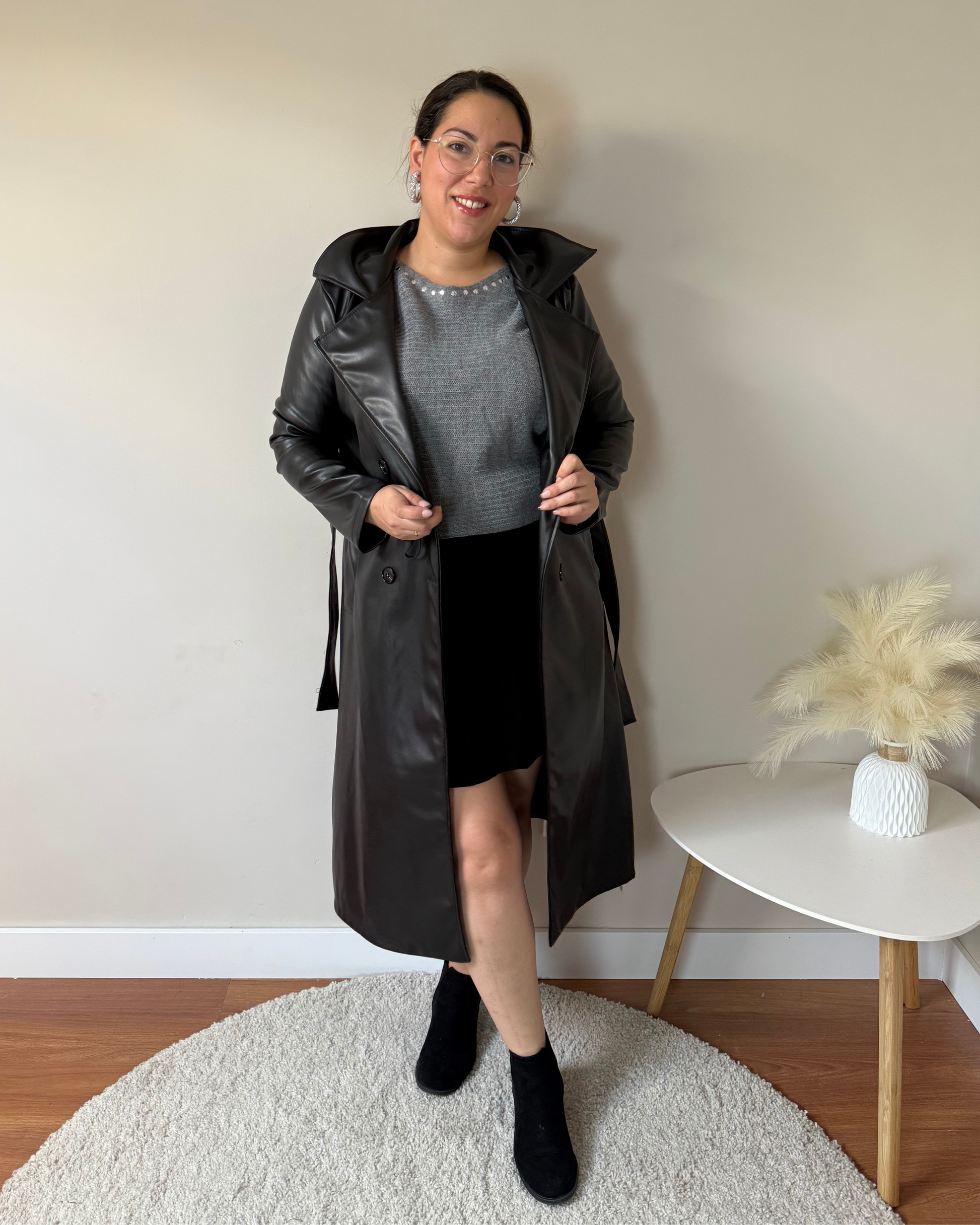 Envuelve tu estilo en elegancia con esta gabardina efecto polipiel. Su diseño con solapas clásicas, cinturón a juego y largo por debajo de la rodilla, estiliza cualquier outfit. Es la prenda imprescindible para un otoño sofisticado, versátil y con mucho carácter.