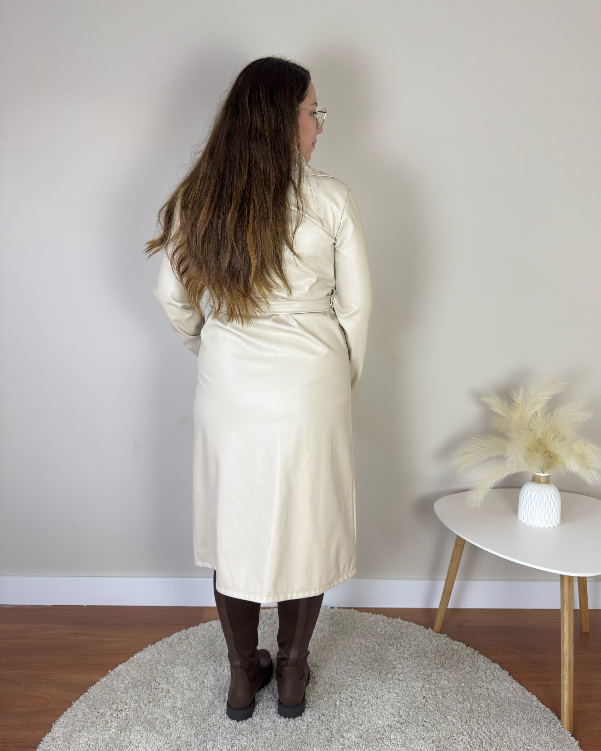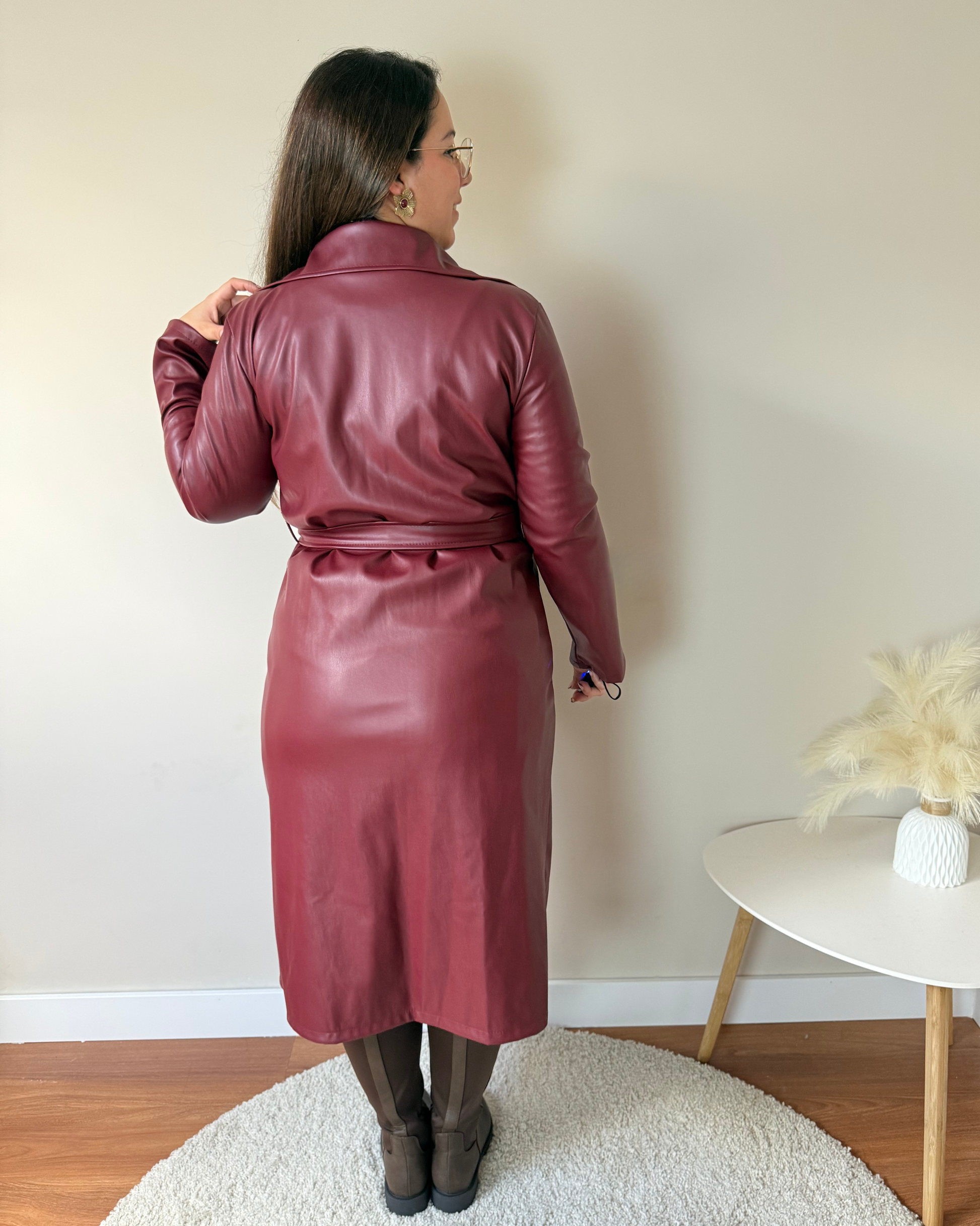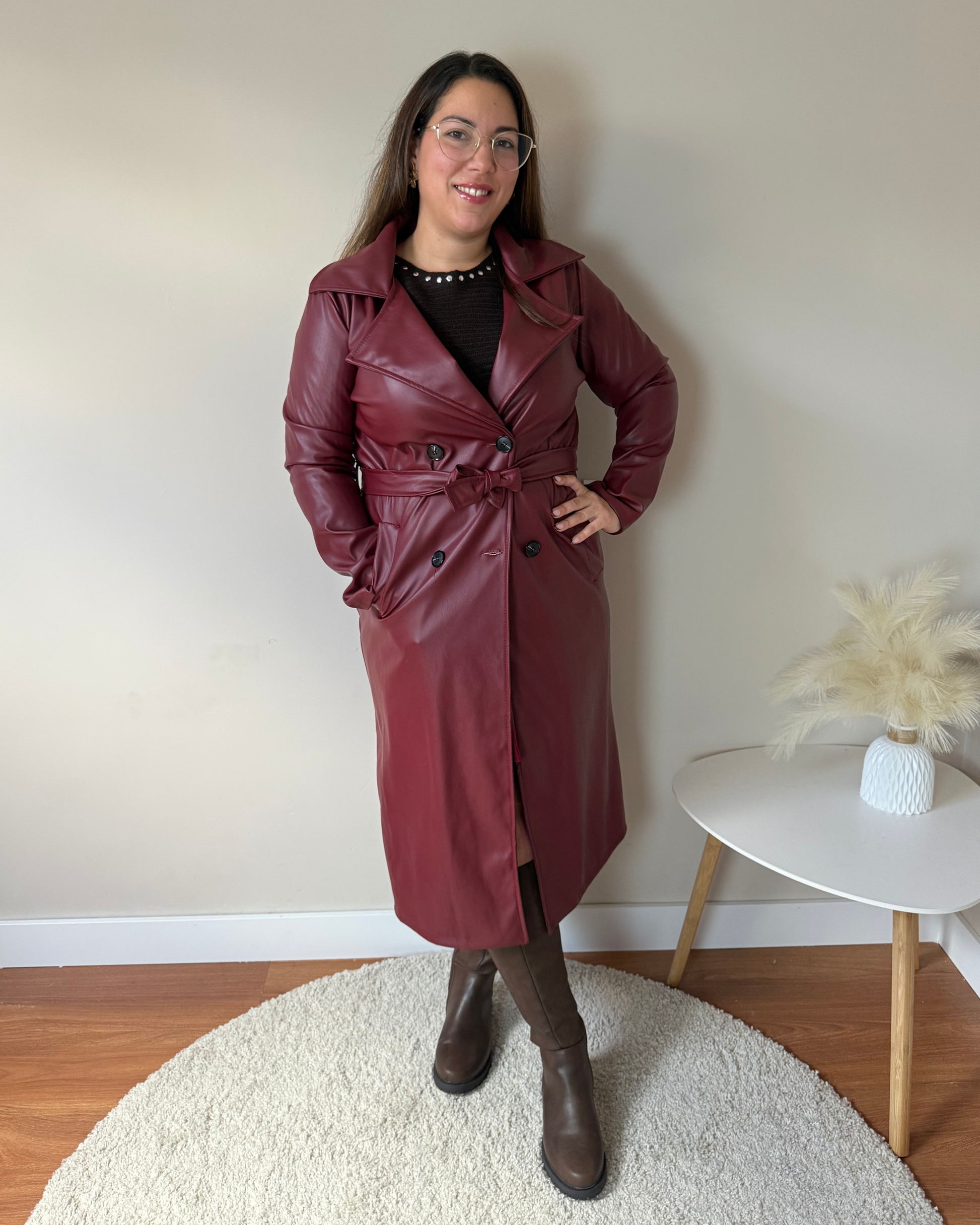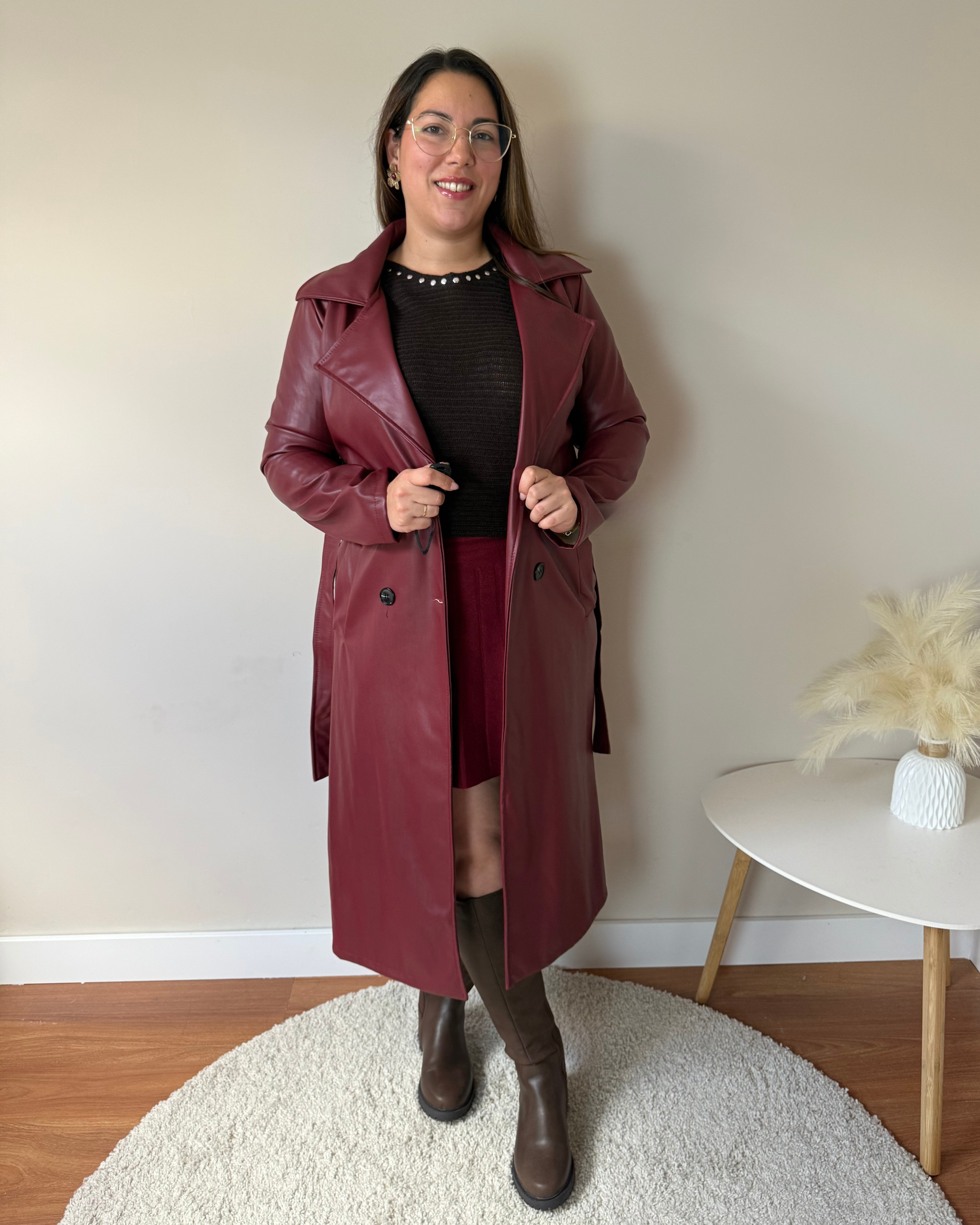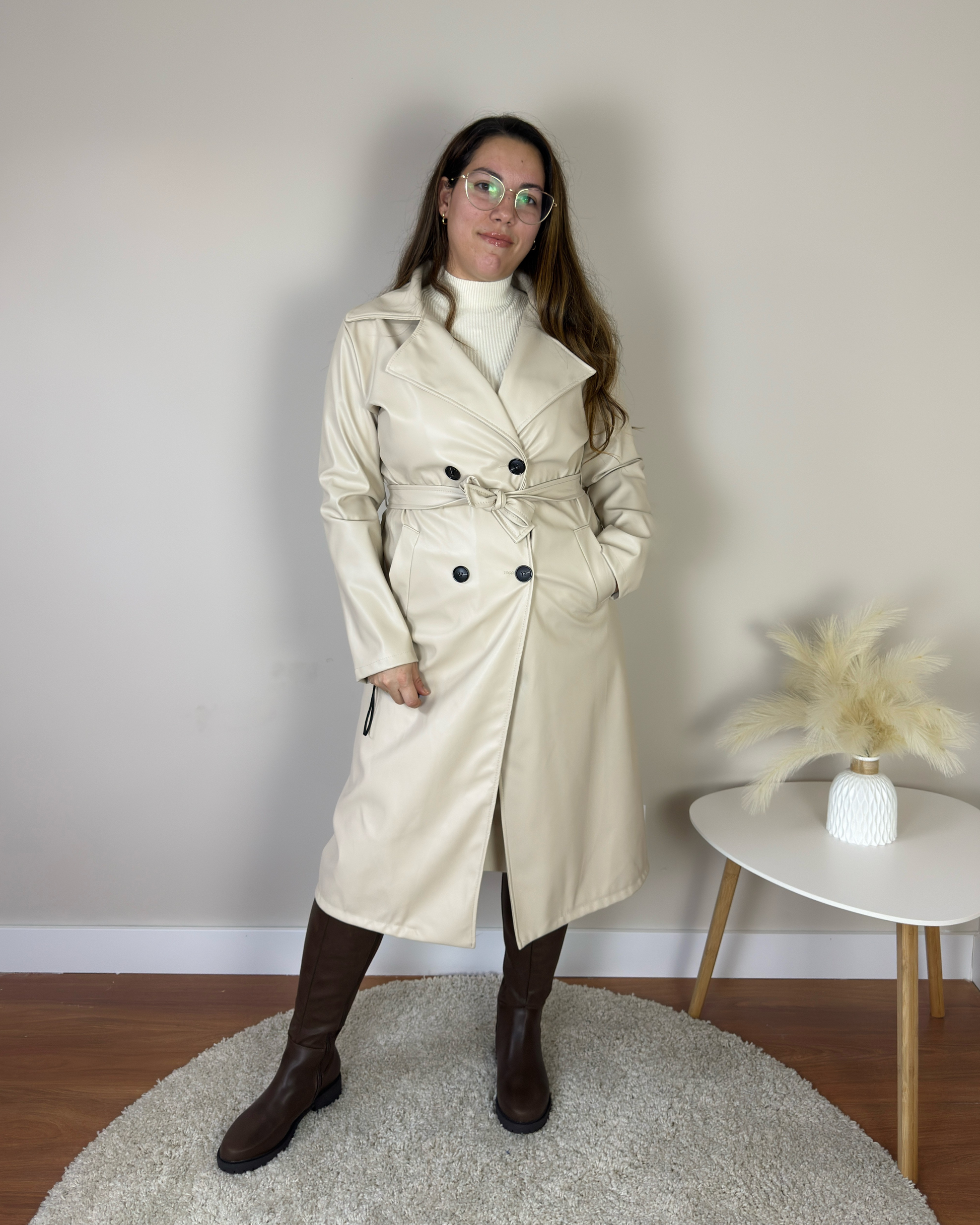 Envuelve tu estilo en elegancia con esta gabardina efecto polipiel. Su diseño con solapas clásicas, cinturón a juego y largo por debajo de la rodilla, estiliza cualquier outfit. Es la prenda imprescindible para un otoño sofisticado, versátil y con mucho carácter.