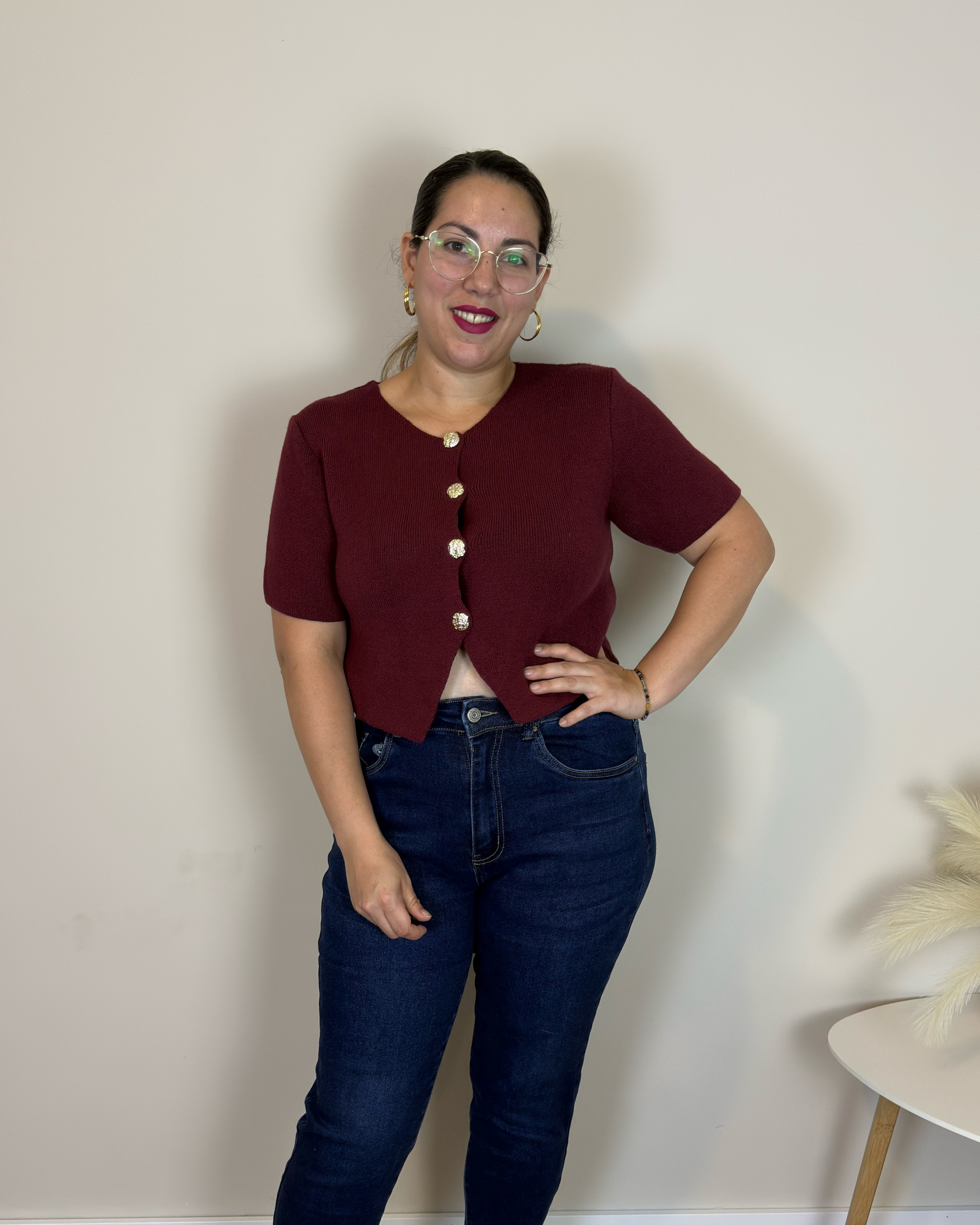 El jersey crop top Rubí combina estilo y carácter. De manga corta, con botones dorados al frente y una discreta abertura inferior, aporta un detalle único que realza cualquier outfit. Su tono burdeos profundo y su corte favorecedor lo convierten en la prenda perfecta para outfits elegantes y versátiles esta temporada.