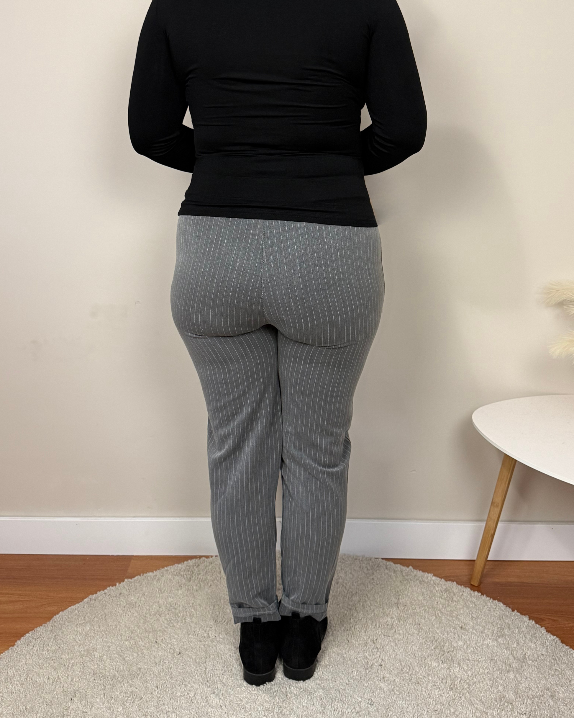 El Pantalon Classic es un pantalón de vestir con finas rayas, corte de pinzas y bolsillos. Su cintura con goma elástica asegura comodidad sin perder elegancia. Una prenda atemporal, perfecta para outfits de oficina o combinaciones mas relejadas en el día a día.