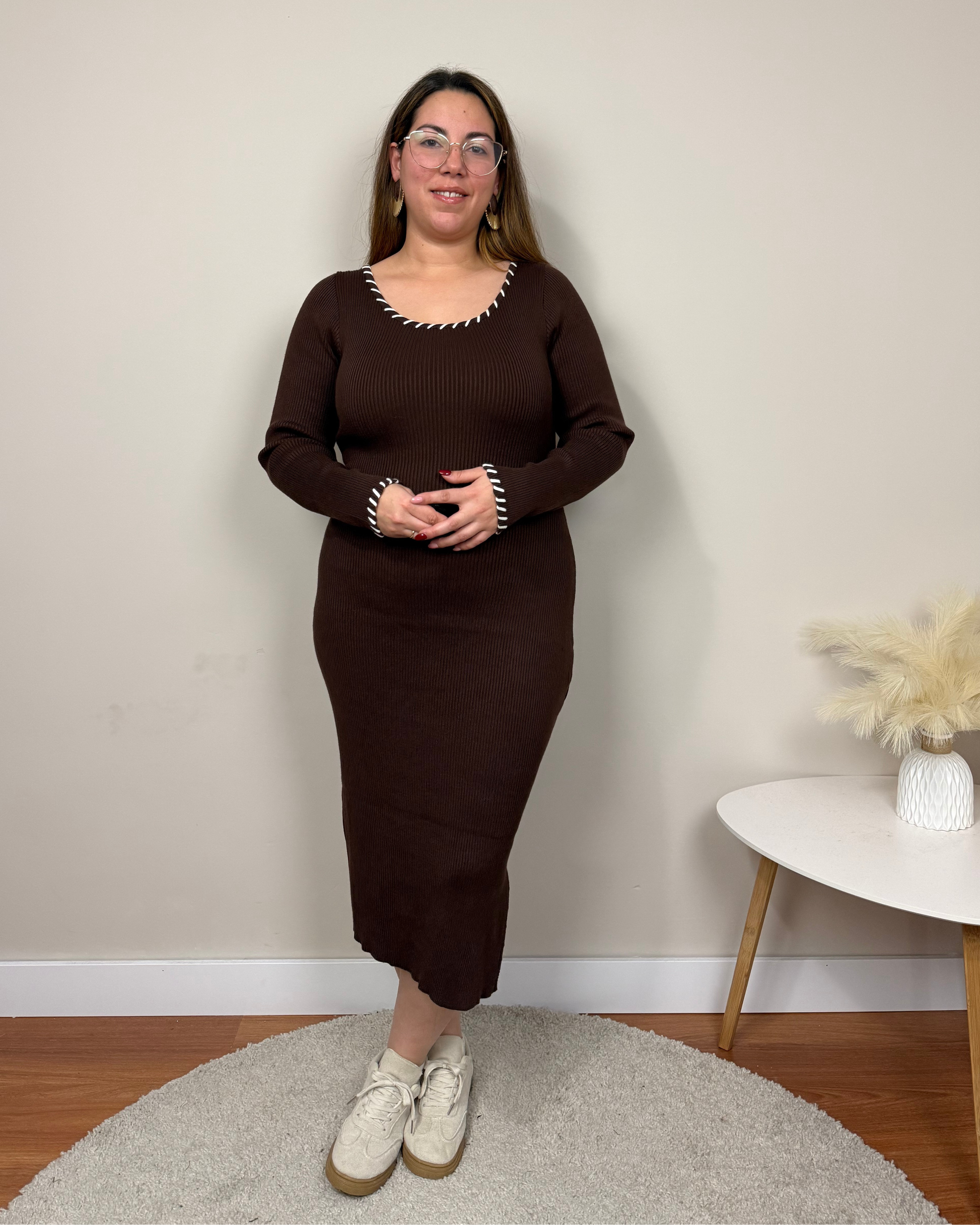 El Vestido Canalé Cordón es un vestido midi de punto canalé, de manga larga y cuello en U con detalle de cordón en contraste en cuello y mangas. Con tejido elástico que se adapta cómodamente a la silueta, ofrece un ajuste flexible y favorecedor, convirtiéndose en una prenda versátil y cómoda para el día a día.